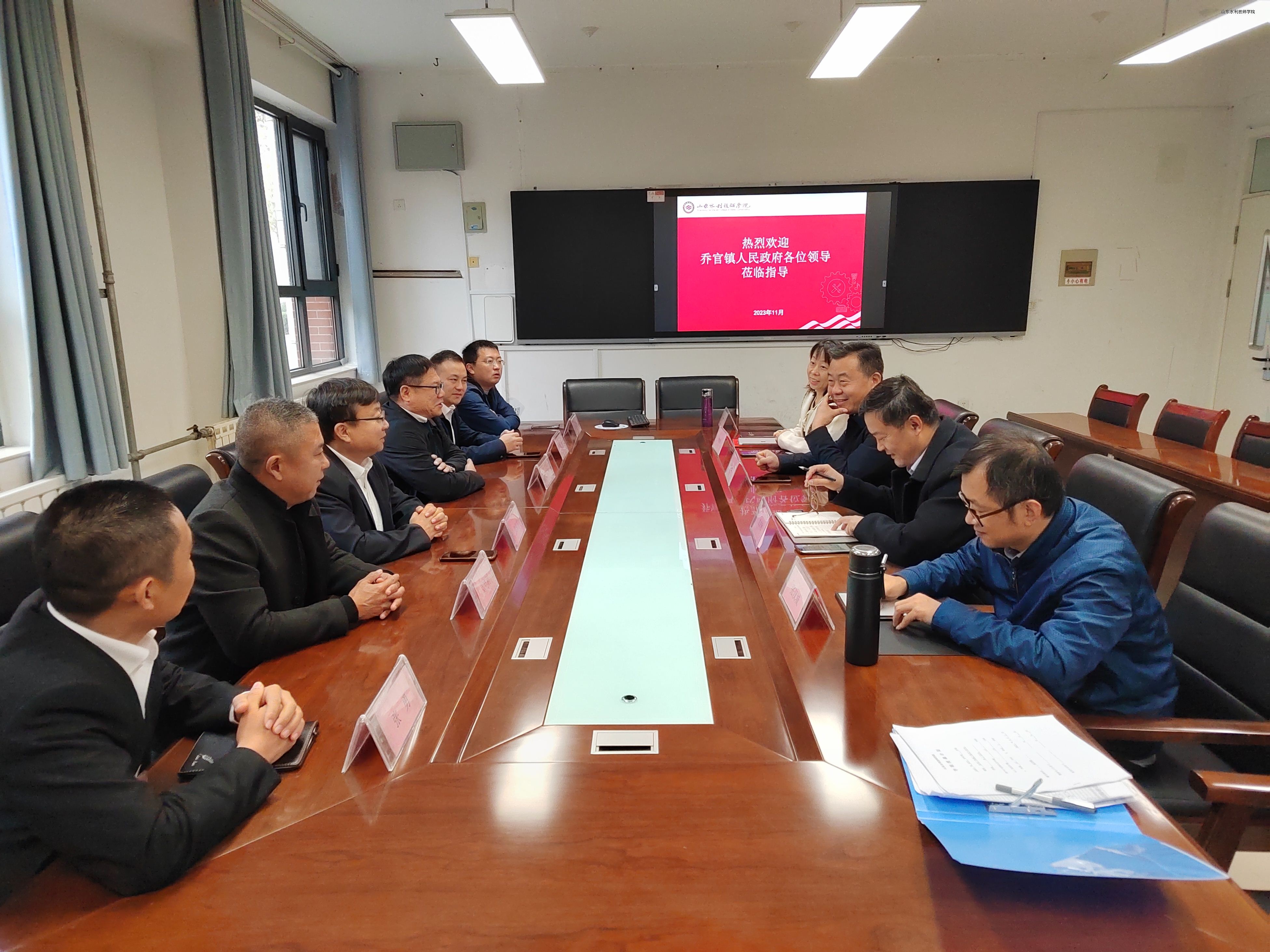 11月8日,潍坊市昌乐县水利局党组成员、南寨水库运营维护中心党支部书记赵建伟,乔官镇党委副书记吴昊、人大副主席郭海滨等一行来到山东水利技师学院,就乔官镇为农服务中心打造“河湖创研中心”等方面,展开深入探讨交流。学院院长边敦典出席座谈会。