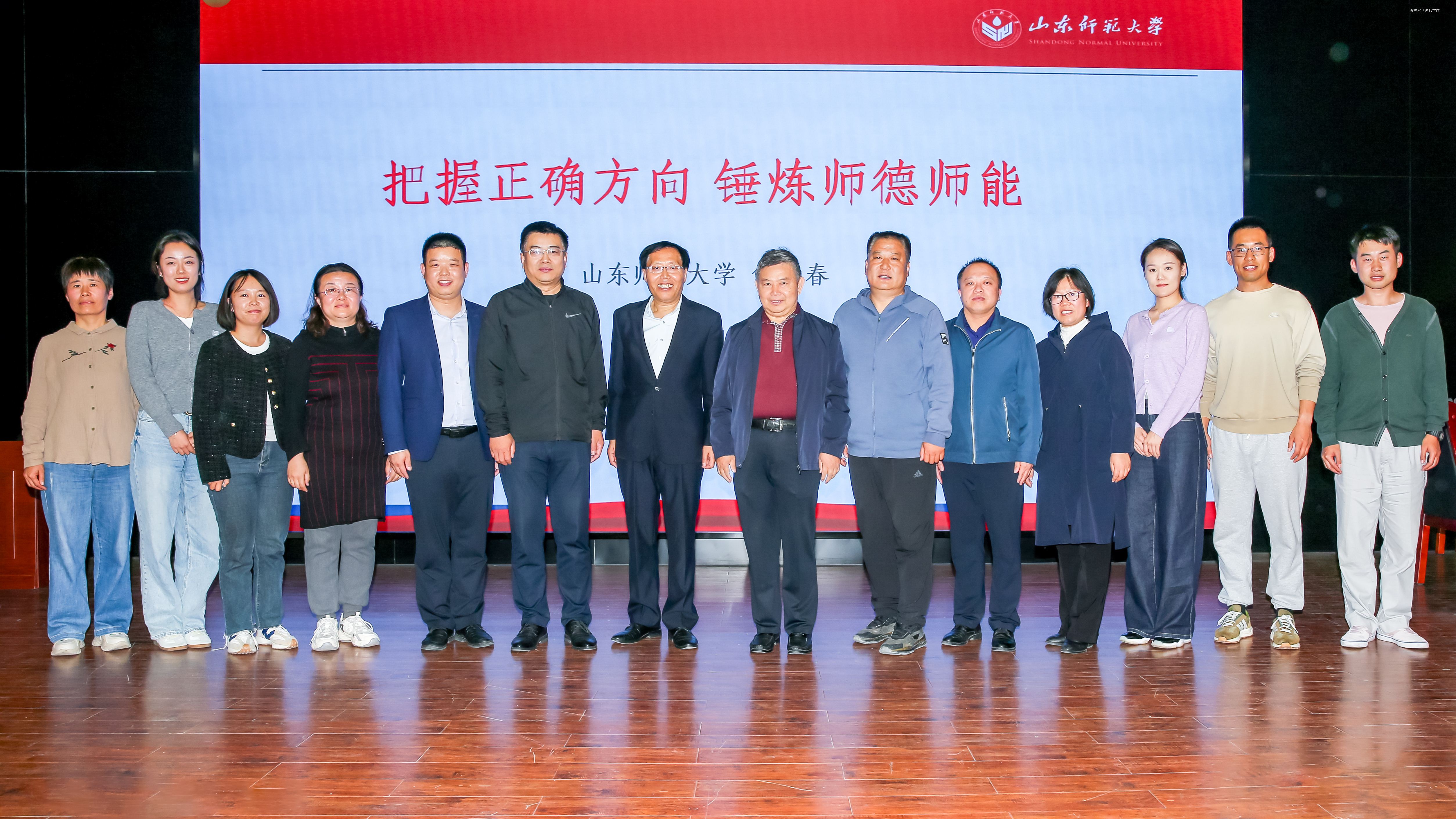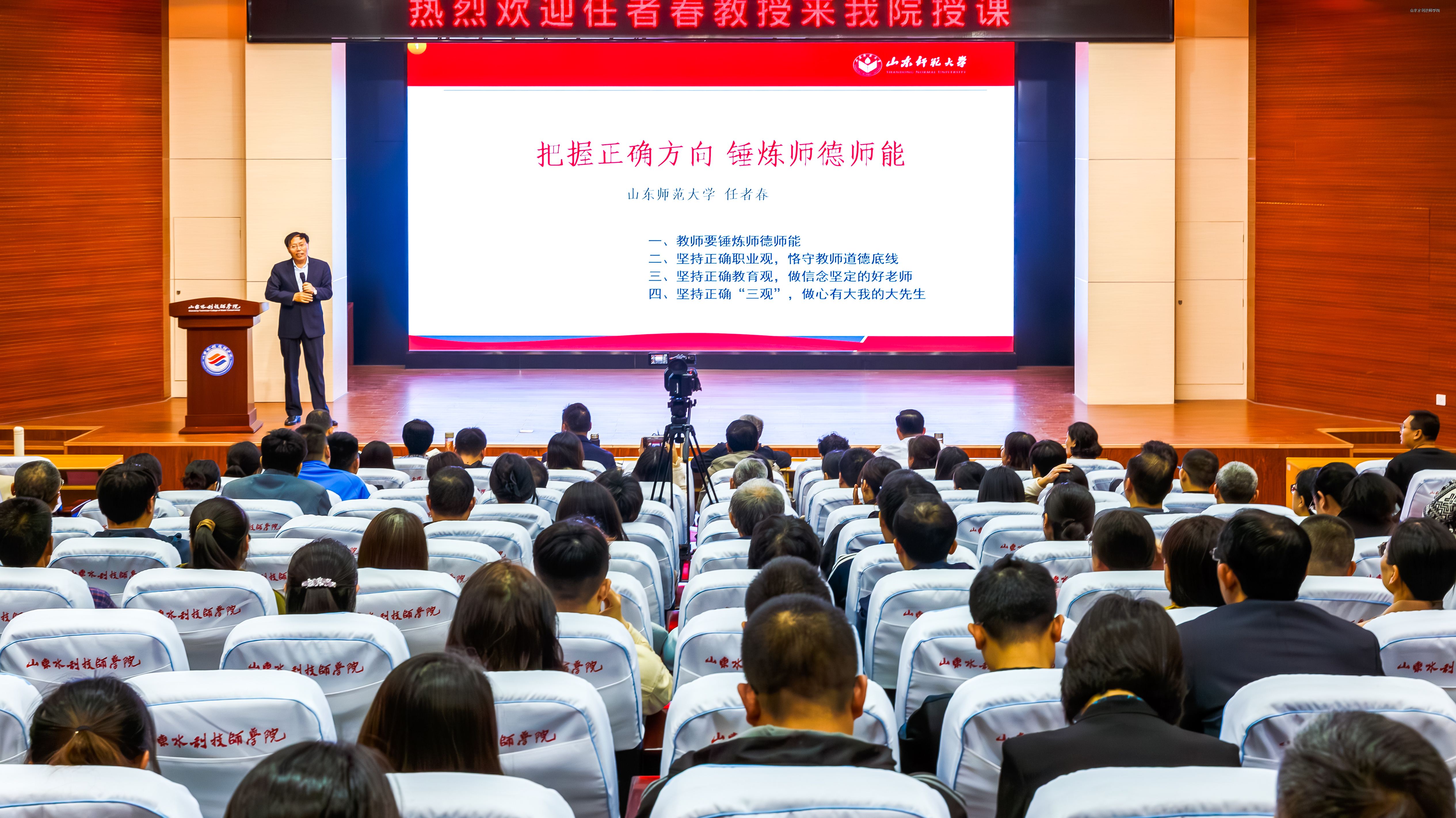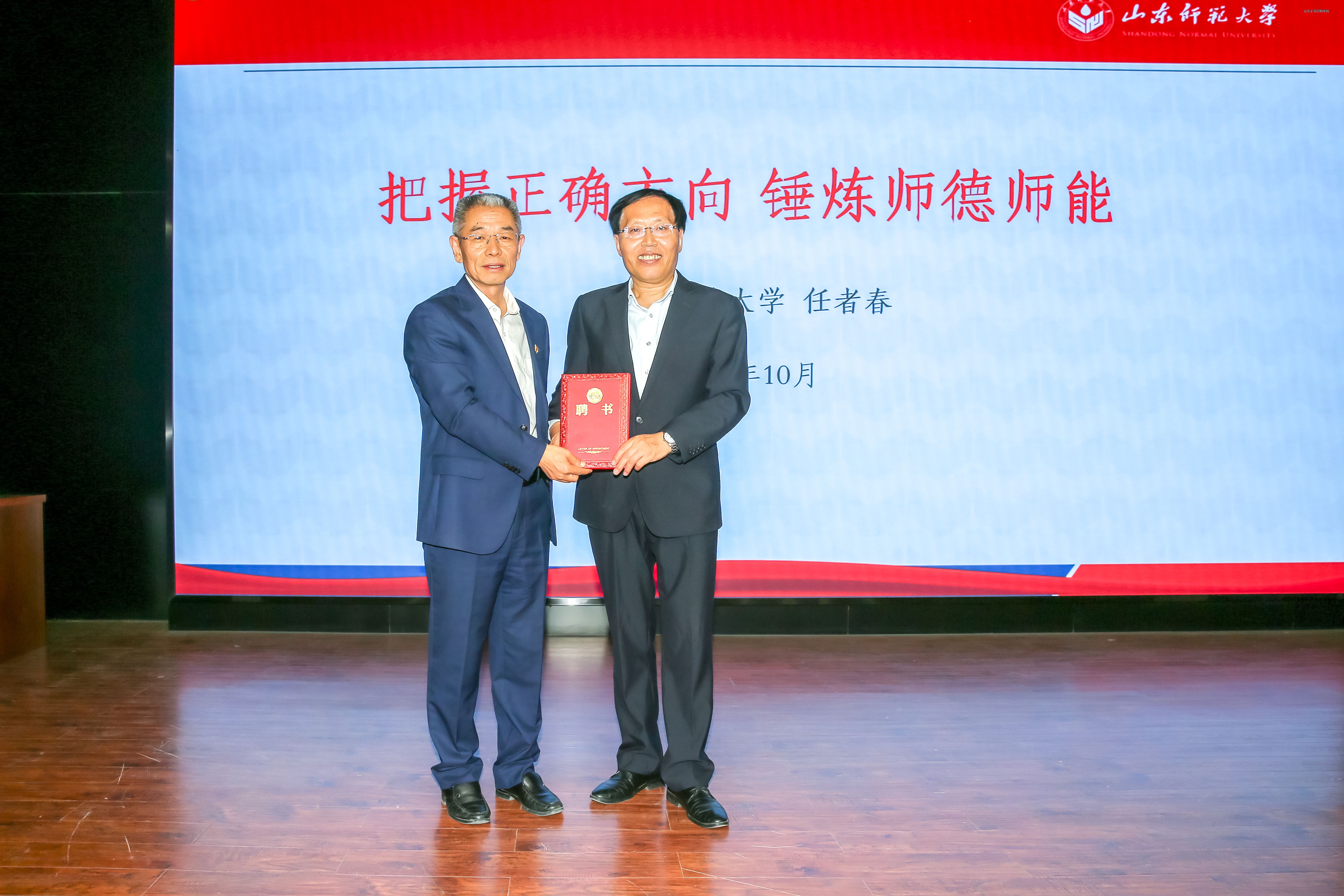 10月23日,山东师范大学马克思主义学院教授、博士生导师任者春到山东水利技师学院,以《把握正确方向 锤炼师德师能》为题,为学院全体教职工作专题报告,为学院校庆65周年献上一份厚礼。学院党委书记于福春为任者春颁发特聘教授聘任证书。