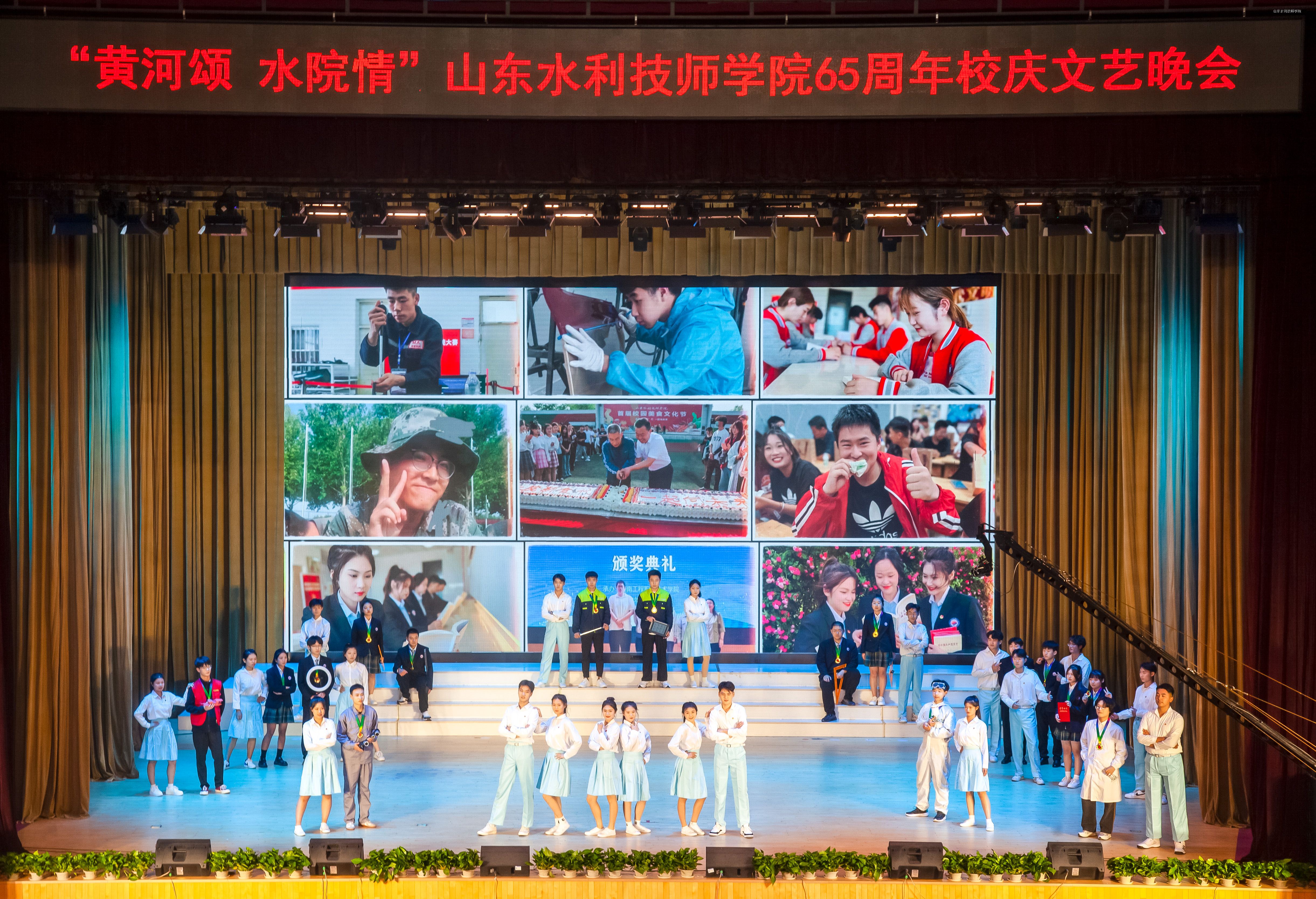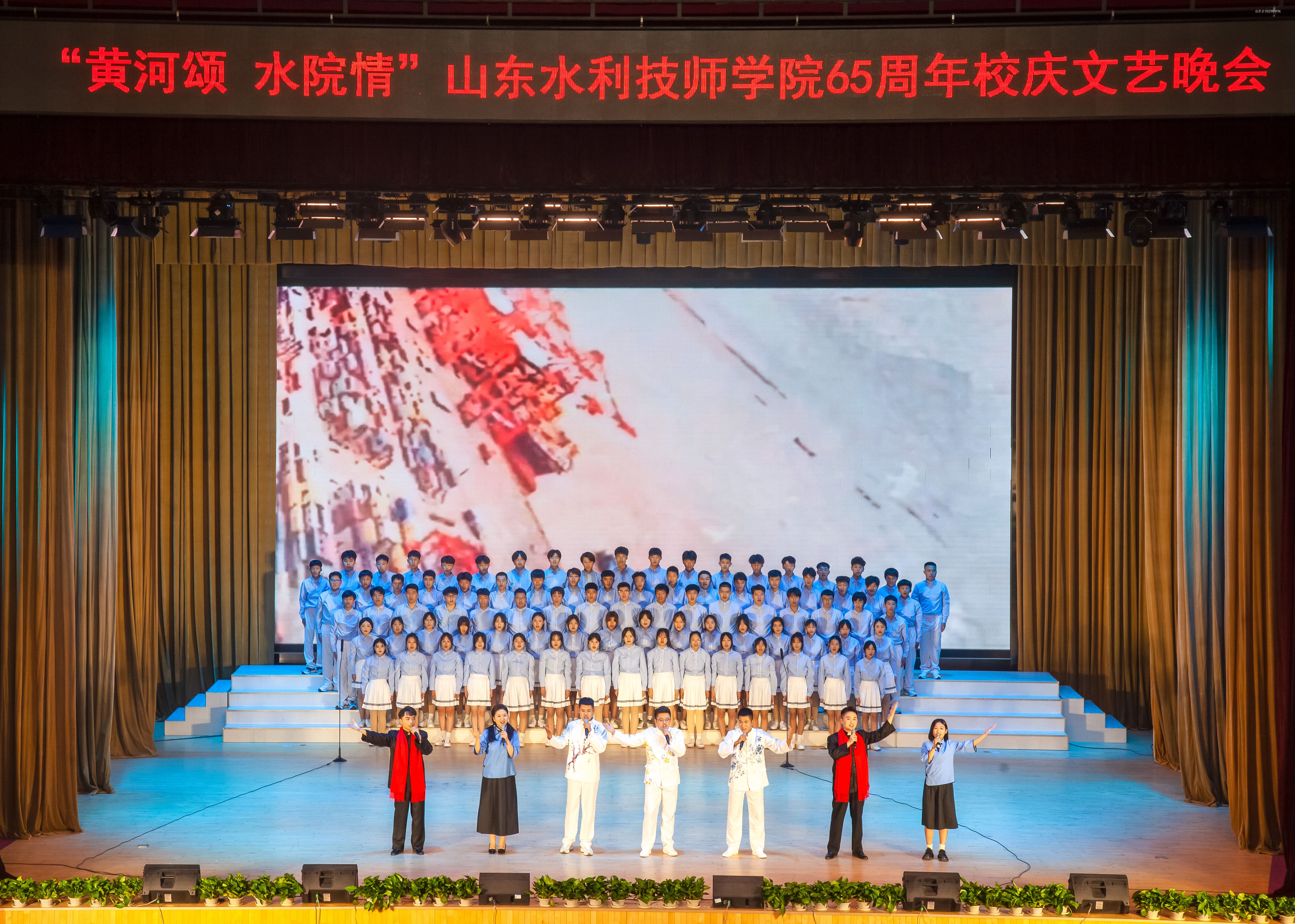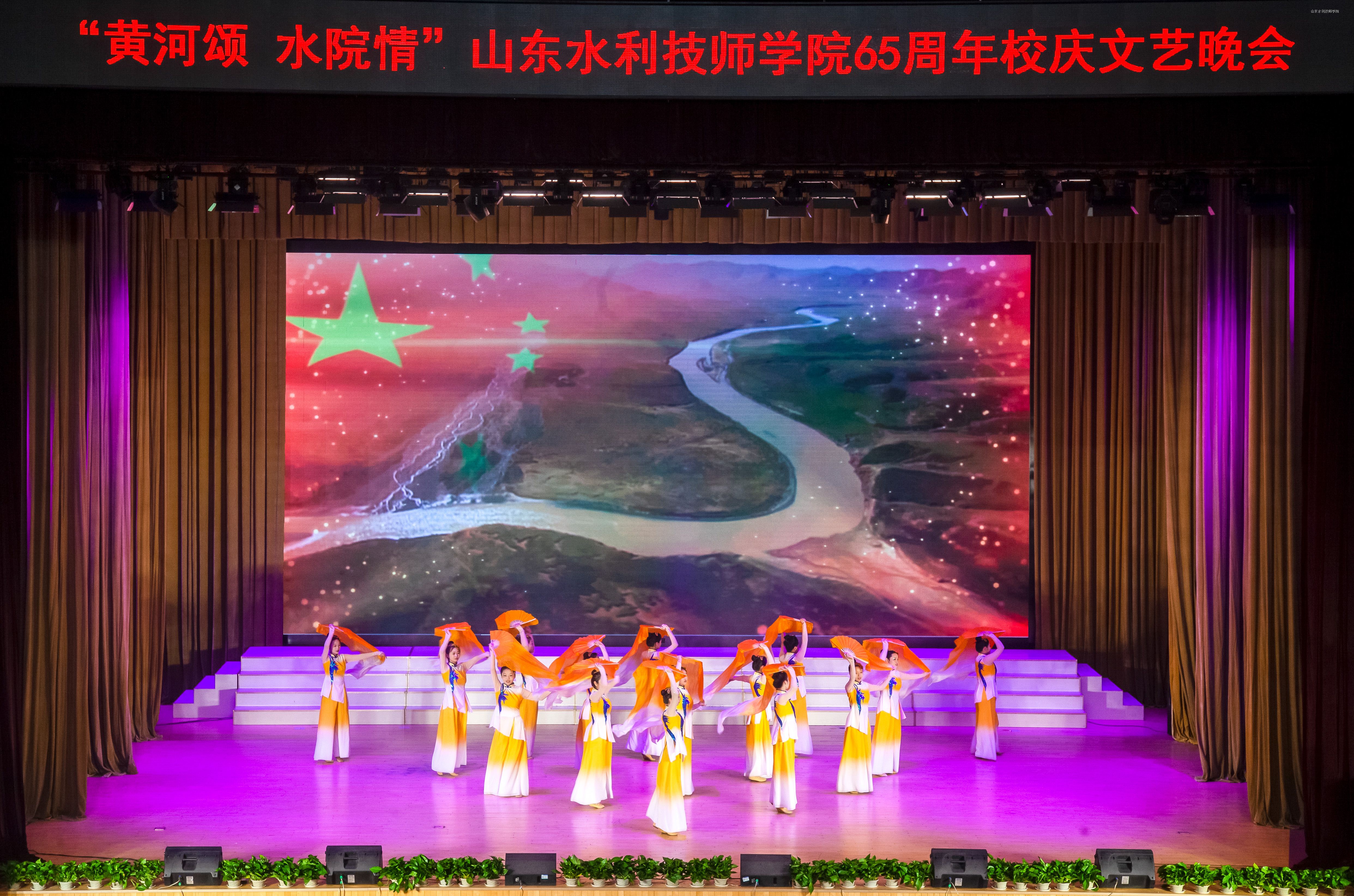 10月18日晚7时,流光溢彩的山东水利技师学院大学生中心内,旗帜高扬,歌声嘹亮,讲述深情,舞蹈翩跹,“武姿”飒爽,掌声如潮——“黄河颂 水院情”学院65周年校庆文艺汇演如期举办。