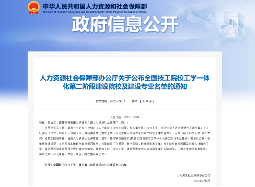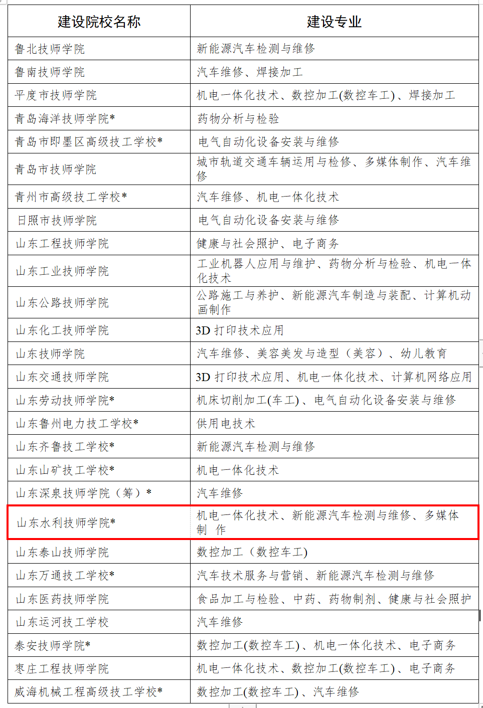 9月11日,人力资源和社会保障部发布《关于公布全国技工院校工学一体化第二阶段建设院校及建设专业名单的通知》,山东水利技师学院获批全国技工院校工学一体化第二阶段建设院校,申报的机电一体化技术、新能源汽车检测与维修、多媒体制作三个专业,全部获批建设立项。
