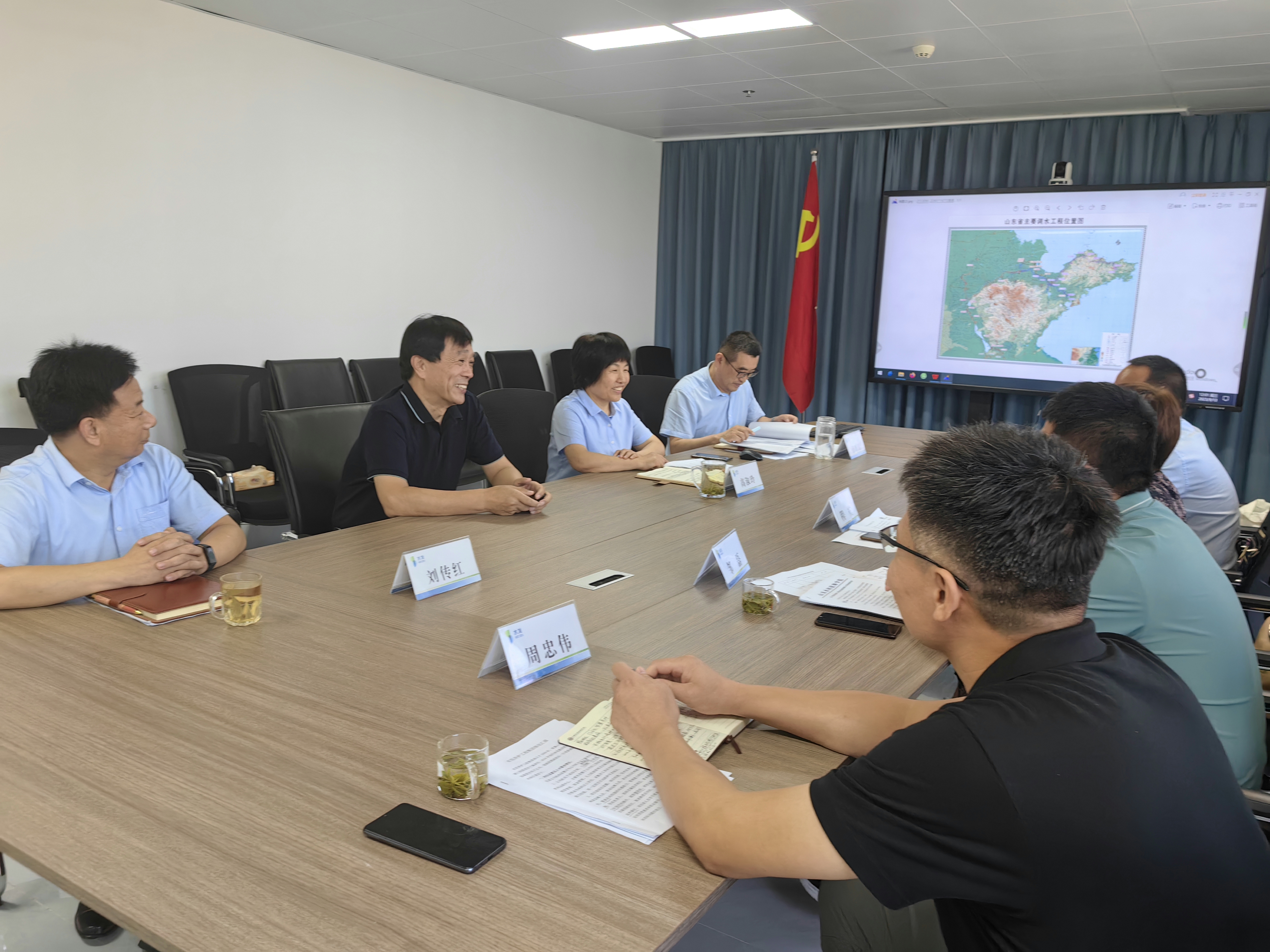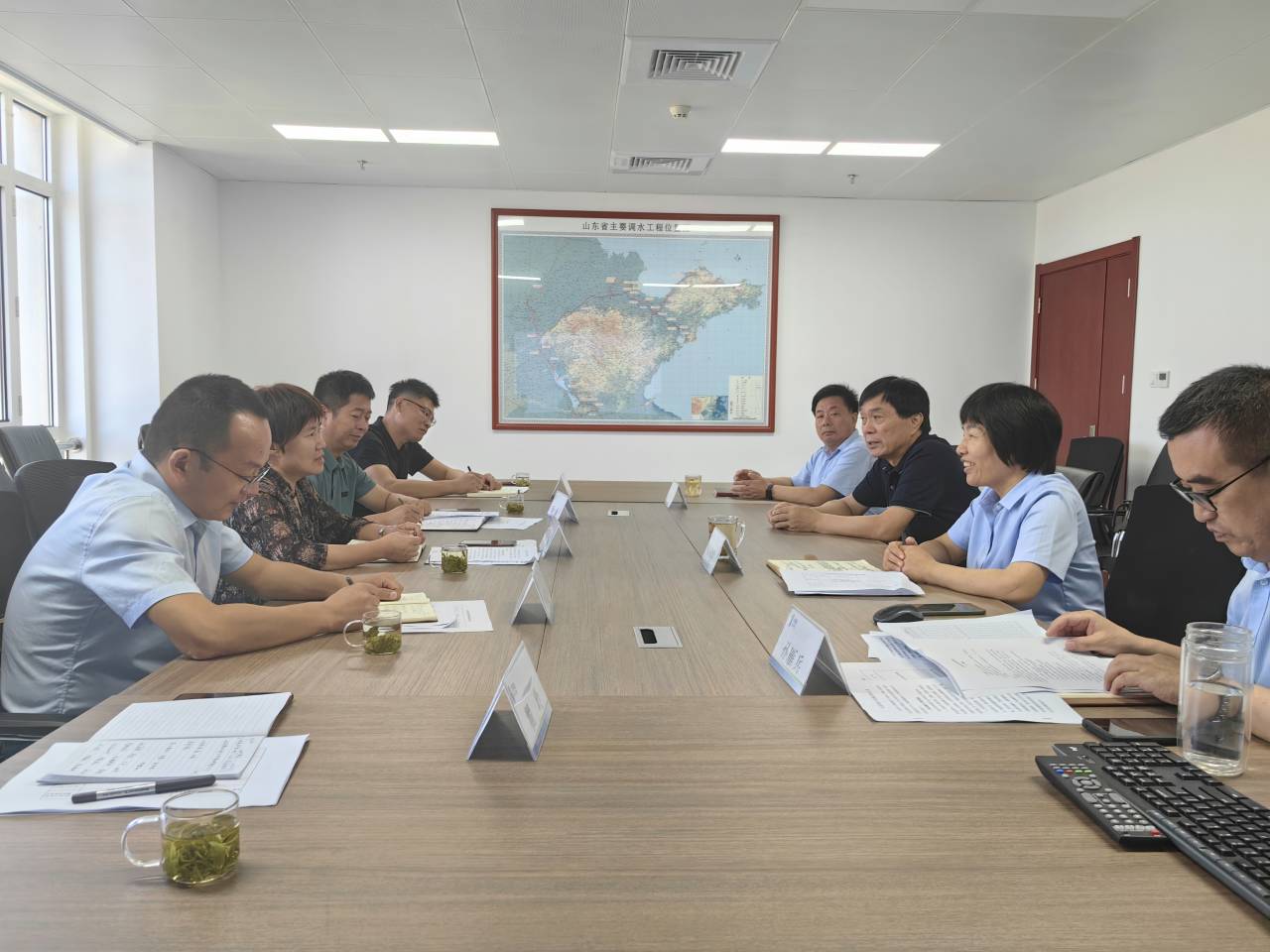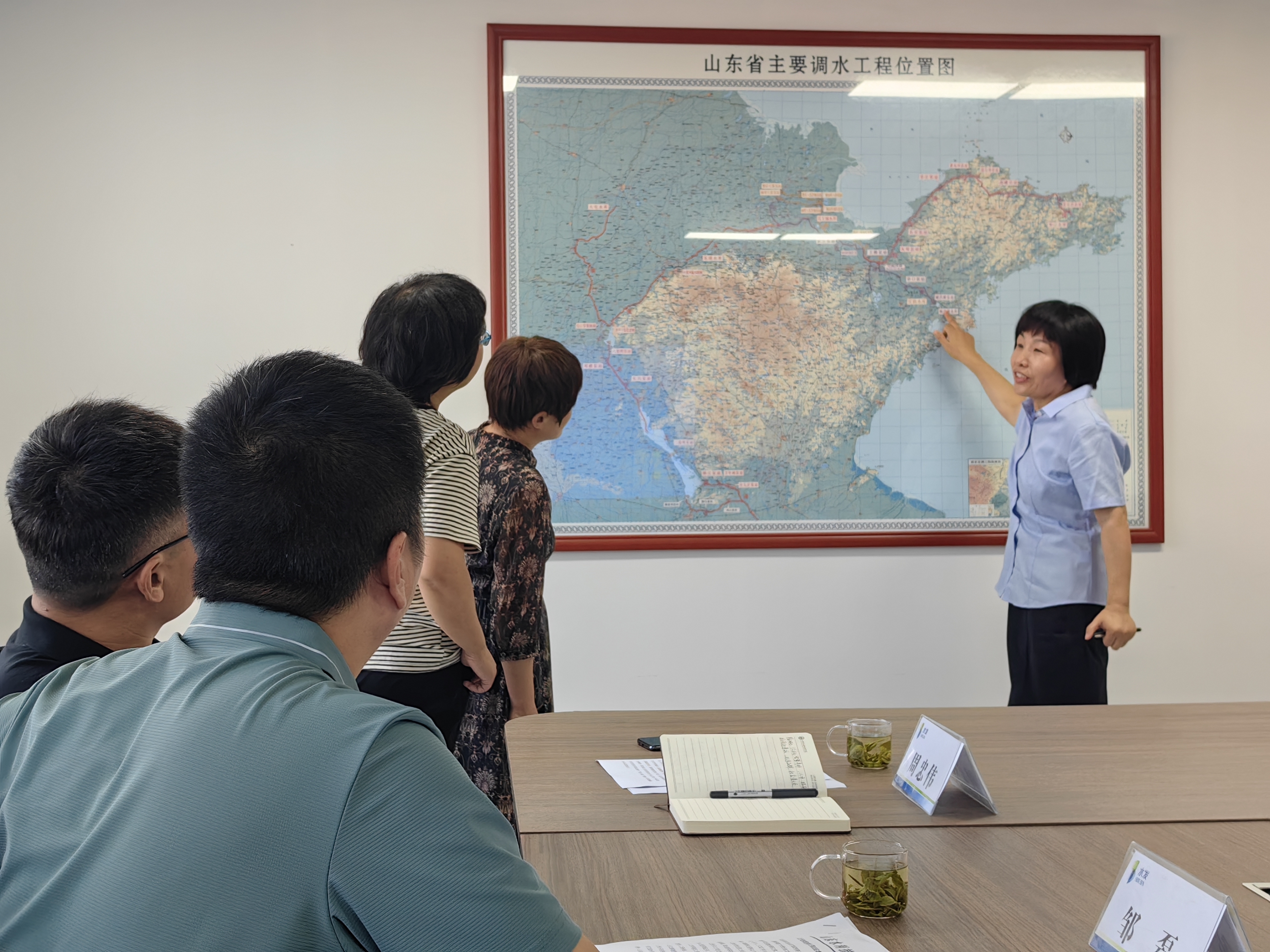 高淑玲向调研一行人员介绍了公司的基本情况,并详细介绍了公司在南水北调、引黄济青、胶东调水等调水工程中参与的养护工程;孙雁兵通过介绍南水北调东线穿黄埋涵出口闸检测维修项目、双王城水库入库泵站1#3#机组大修项目、引黄济青沉沙池出口闸闸站形象提升工程等项目实施过程,向调研人员展示了企业高超的专业养护能力和精益求精的工匠精神。