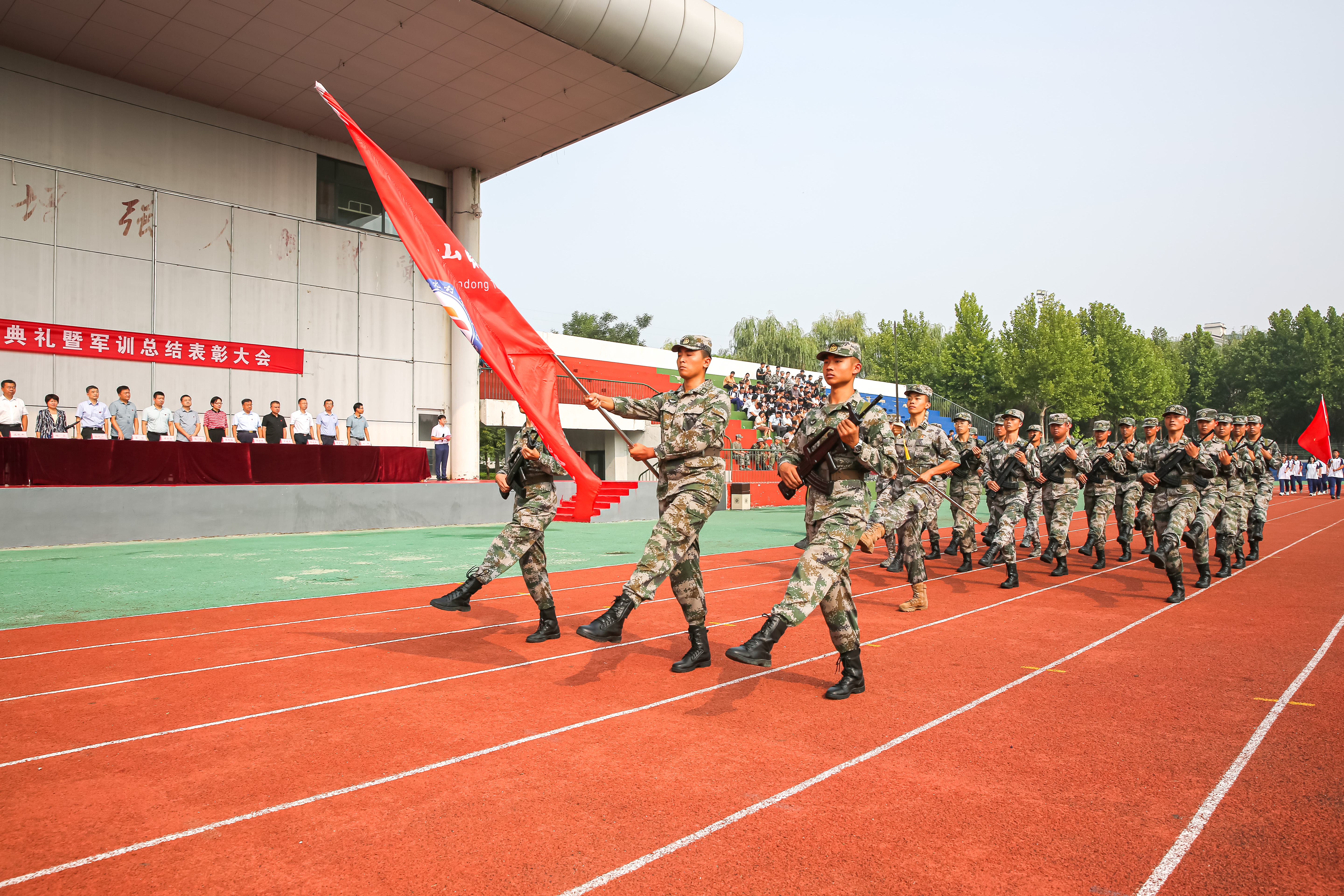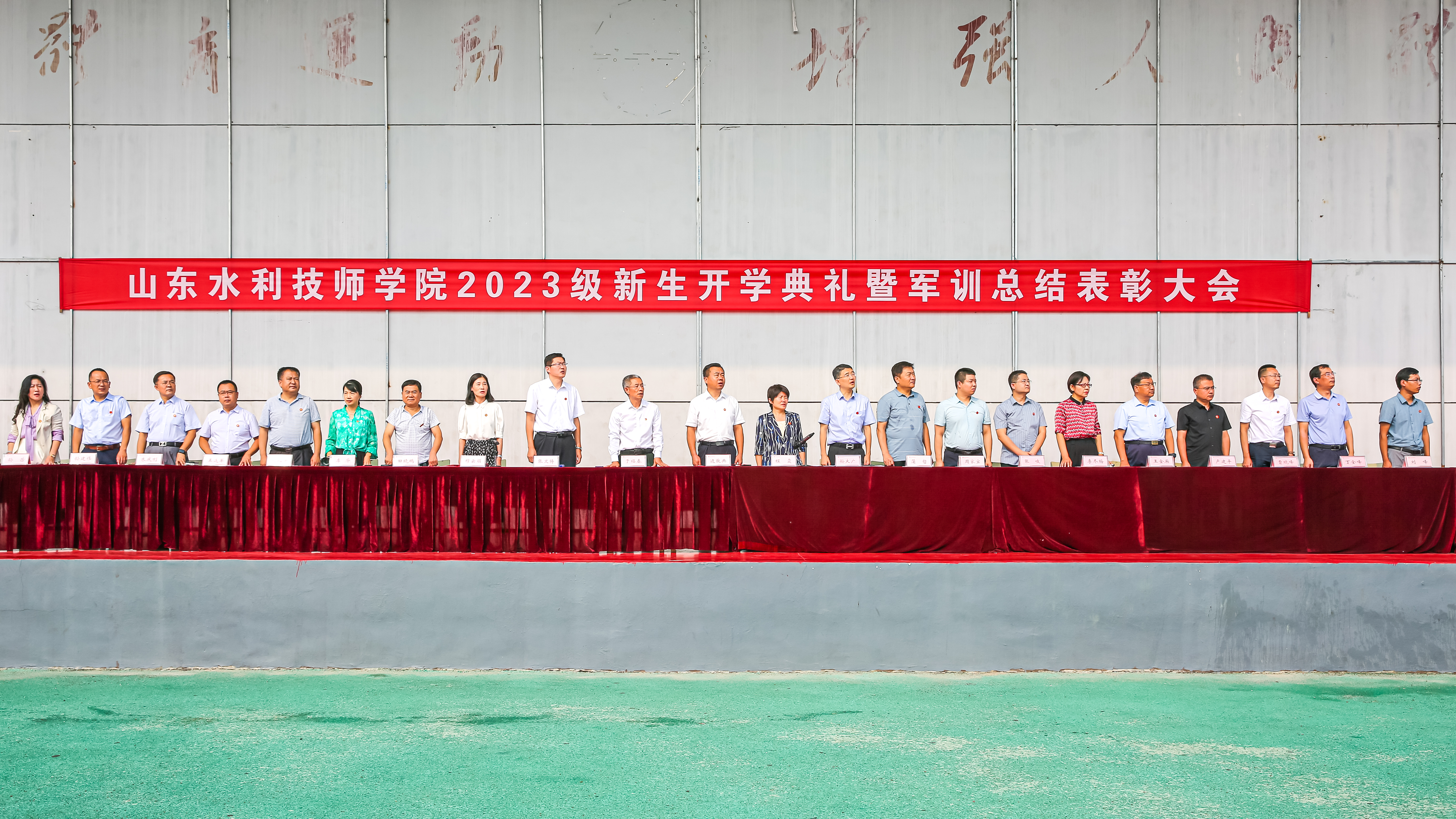9月1日,初秋时节的山东水利技师学院田径场上,依然骄阳胜火。比太阳更火热的,是端坐在主席台上的院领导和各部门主要负责人那望眼欲穿的热切目光,是伫立在操场上的23个受阅方队的学生们那喷薄欲出的雄心壮志——学院2023级新生开学典礼暨军训总结表彰大会如期举行。