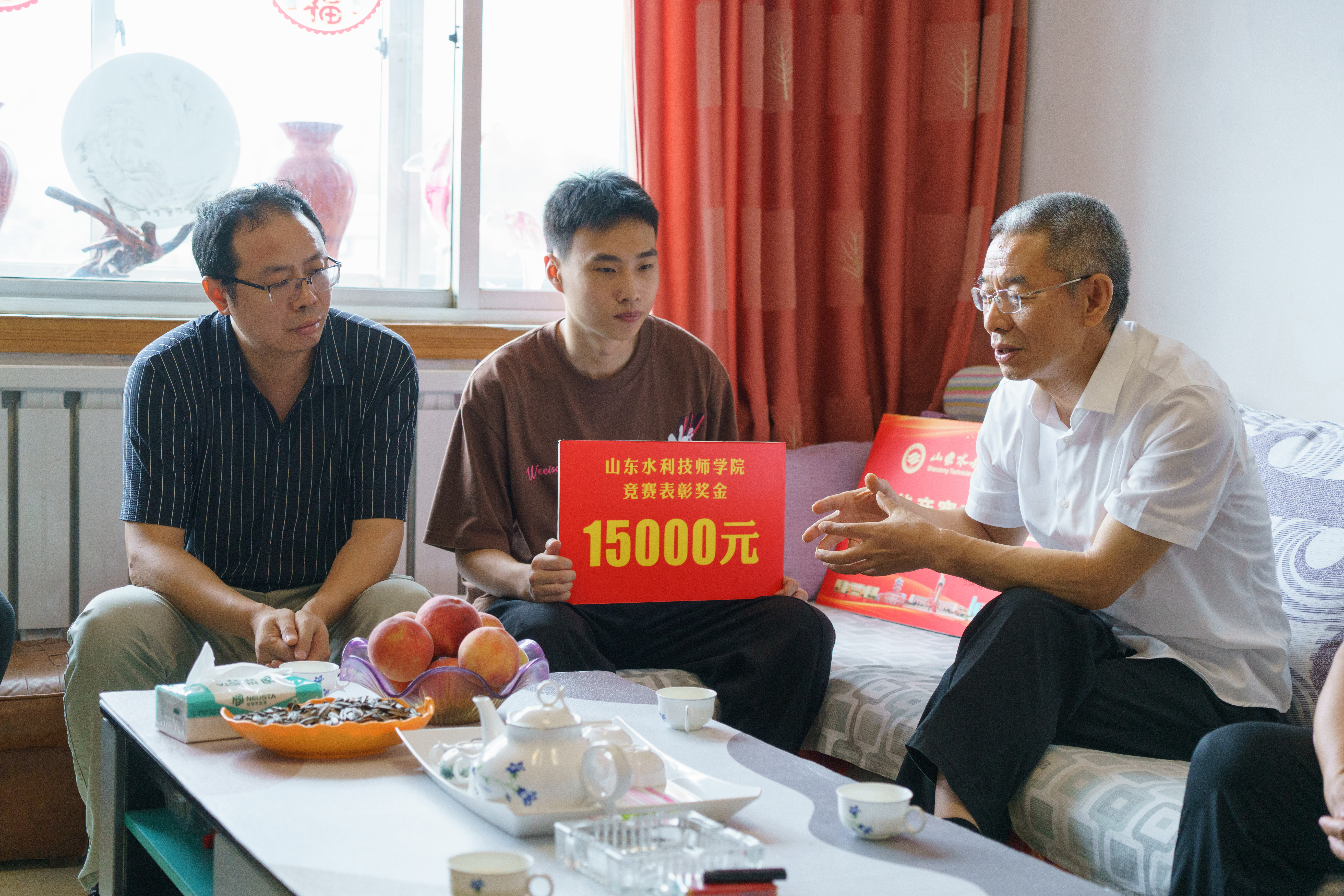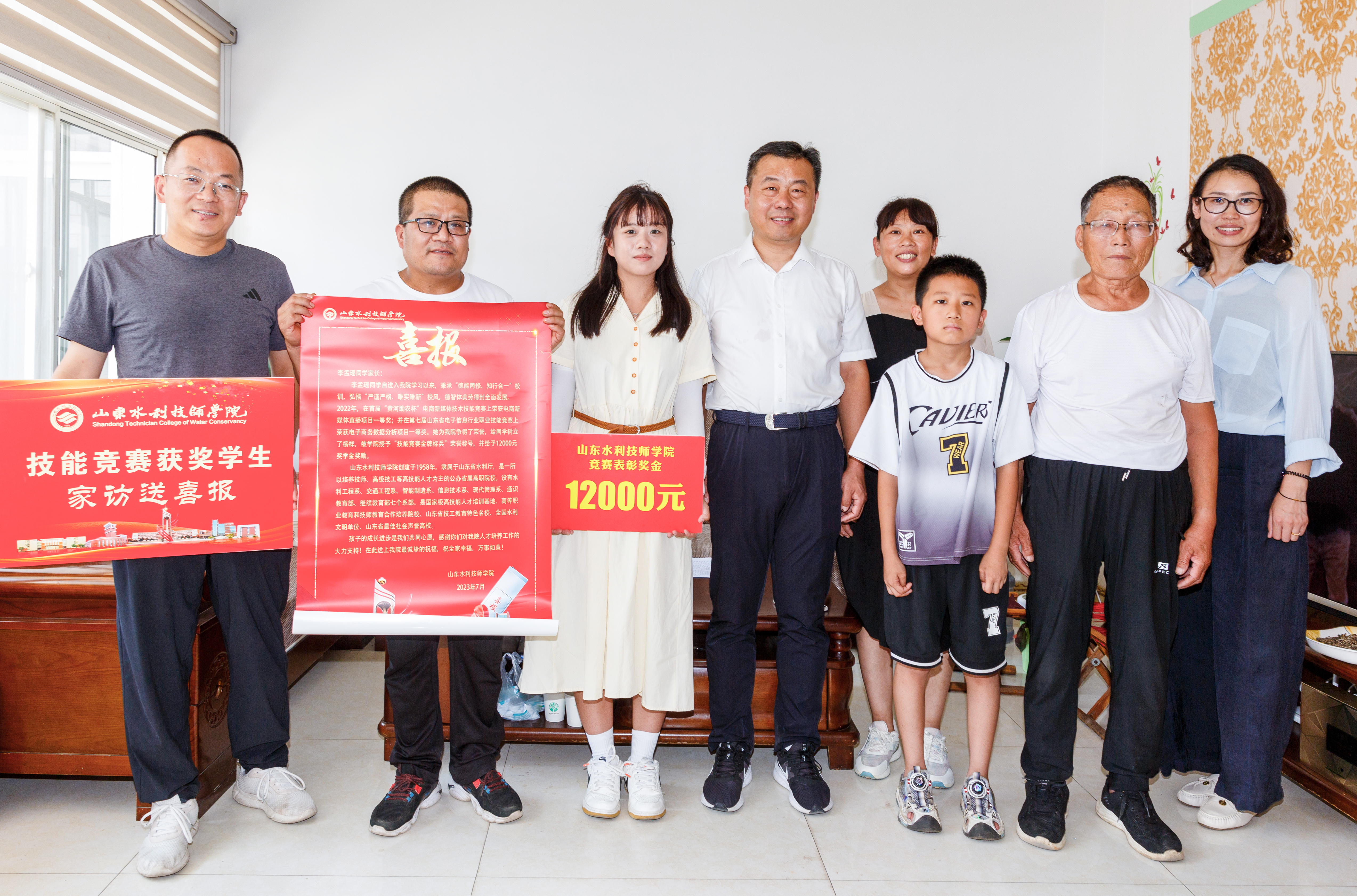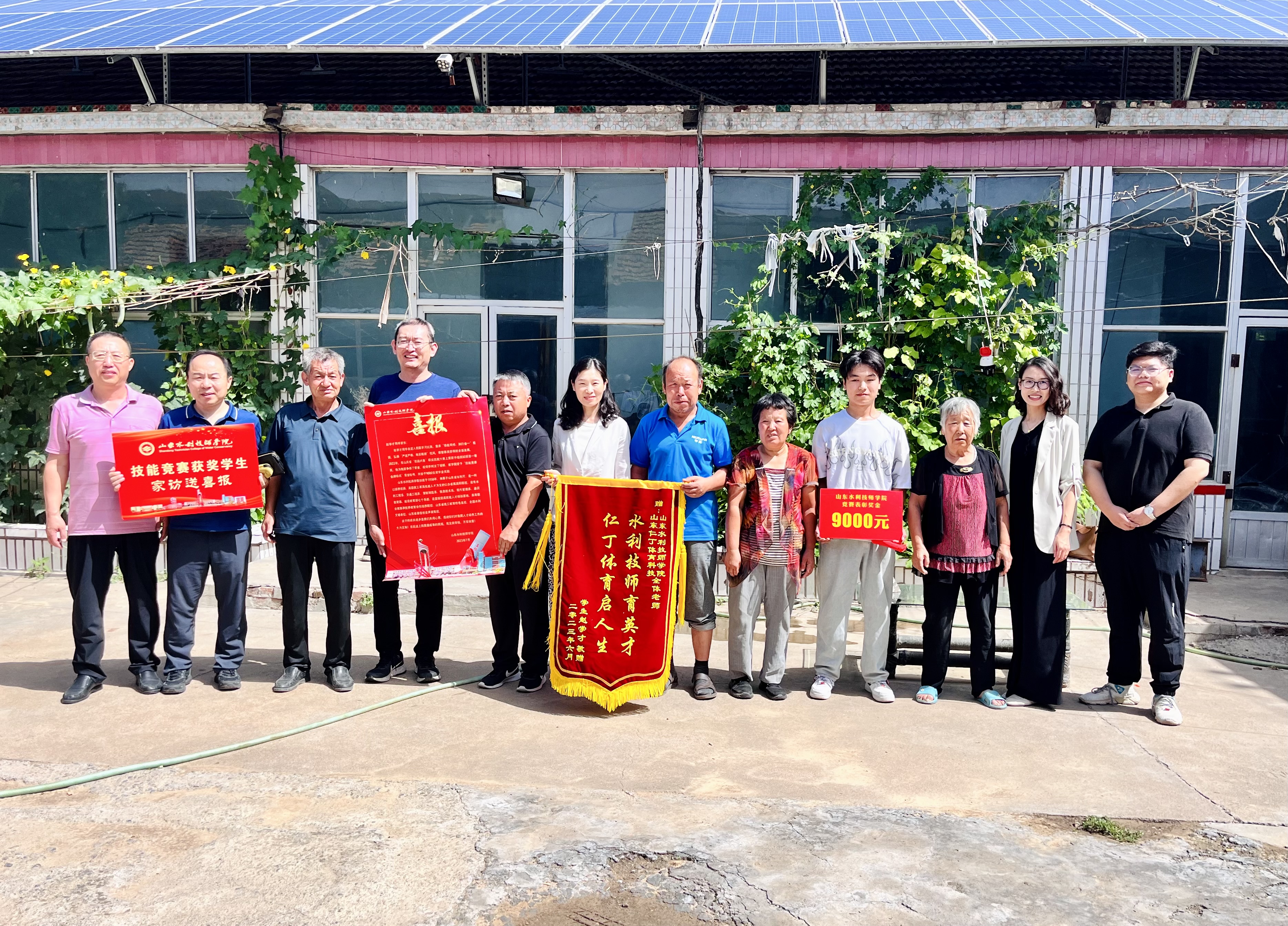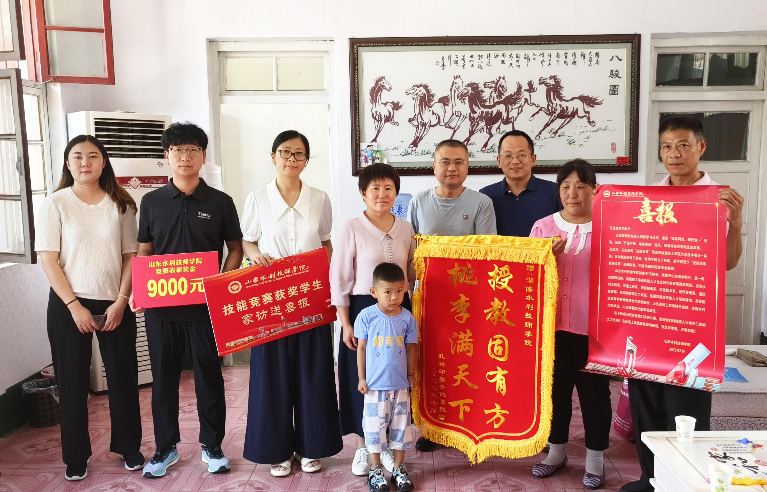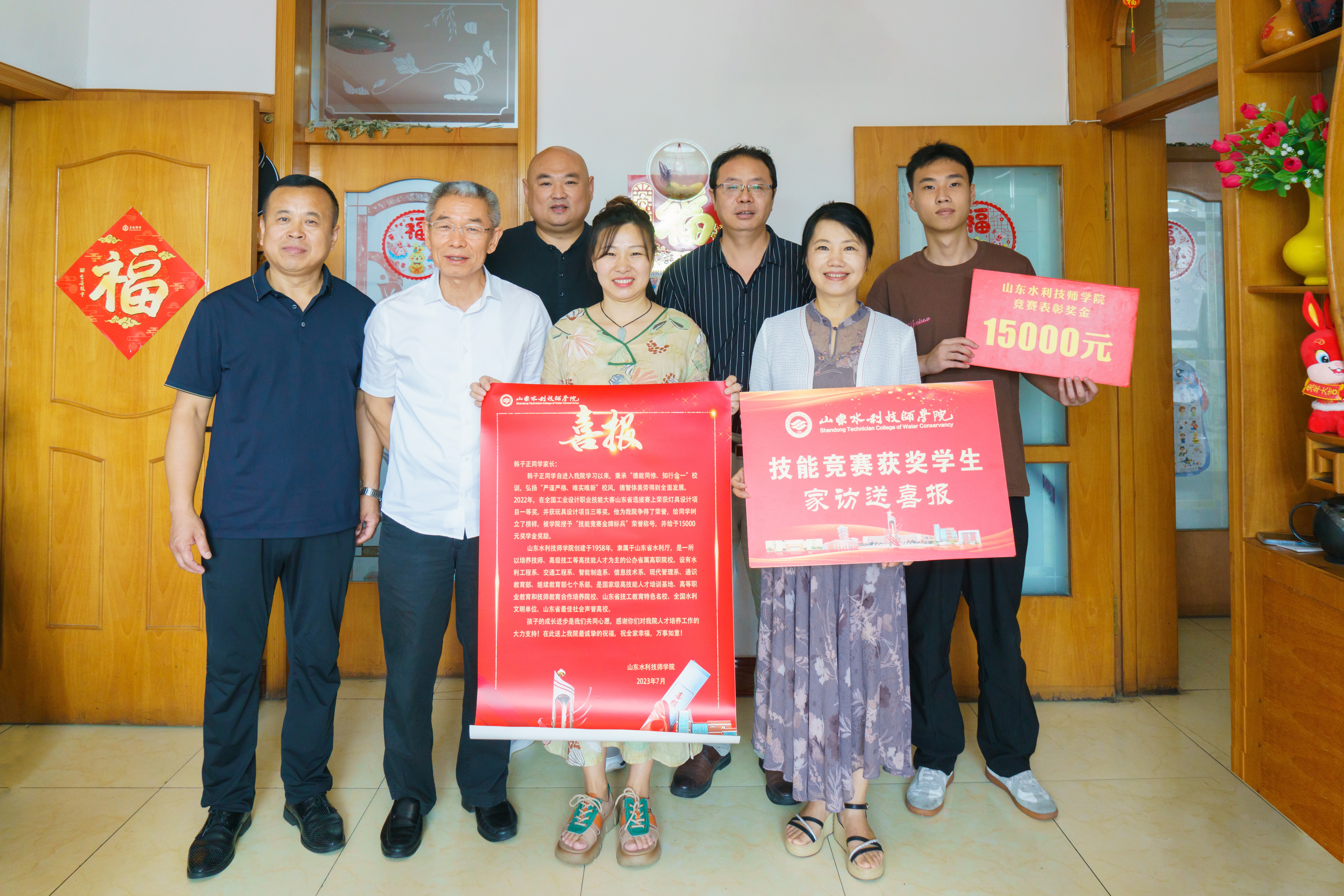 近日,山东水利技师学院党委书记于福春一行,给家住淄博市博山区白塔镇南万山村,在全国工业设计职业技能大赛山东省选拔赛中获得灯具设计项目一等奖、玩具设计项目三等奖的智能制造系学生韩子正,送来了红彤彤的技能竞赛表彰喜报和15000元表彰奖金。恰逢学院正在该村举行暑假社会实践暨志愿服务活动,吸引了众多的乡亲围观,于福春由衷地对他们报喜道贺。此举,既拉开了学院2022年度家访送喜报活动的序幕,也是学院进一步深化“家访报喜·爱出爱返”党建品牌建设,以及推进“五育并举”全环境育人体系建设的重要举措。