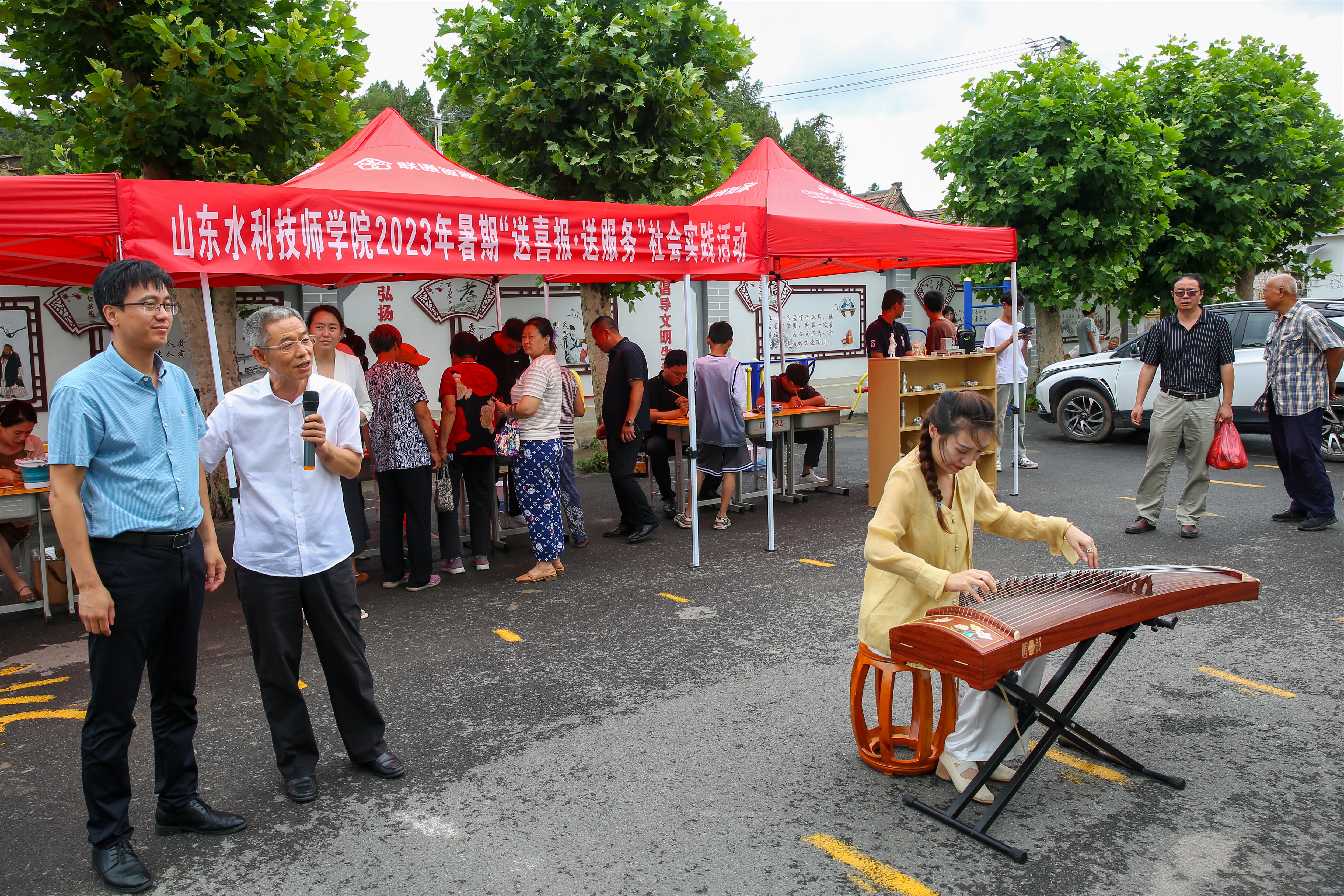 于书记来到村里广场,看到学院两组教师在绘制扇子,一组古筝演奏,特有文化氛围,一些村民们排队领取精美的扇子,喜爱之情溢于言表,一些村民坐在边上欣赏音乐。于书记非常高兴。他接过话筒,面对南万山村的村书记和乡亲们说:“今天,我们来到你们村的韩子正家中做家访,送喜报,韩子正在技能大赛中获了奖,既是我们水院的骄傲,更是你们南万山村的骄傲,感谢你们培养出这么优秀的青年学子……”书记的一番话,让一名学生的成绩变成了全村人的荣耀,也把水院故事讲到了28公里之外的南万山村,乡亲们顿时响起雷鸣般的掌声。