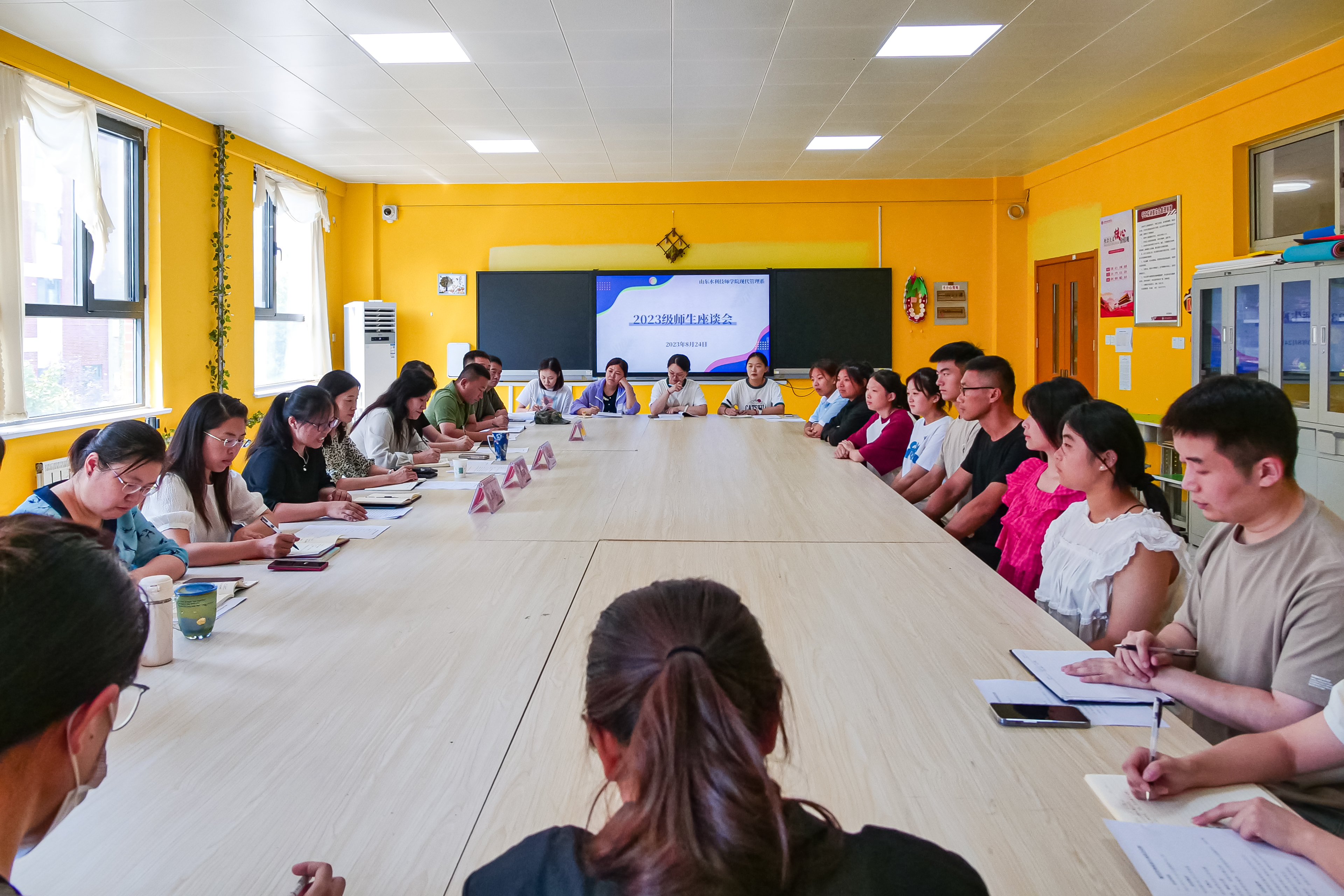 8月24日上午,山东水利技师学院现代管理系召开师生座谈会,进行面对面零距离谈心交流。学院副院长穆云丽出席会议并讲话,2023级新生代表、系部全体教师、系学工组全体辅导员参会。