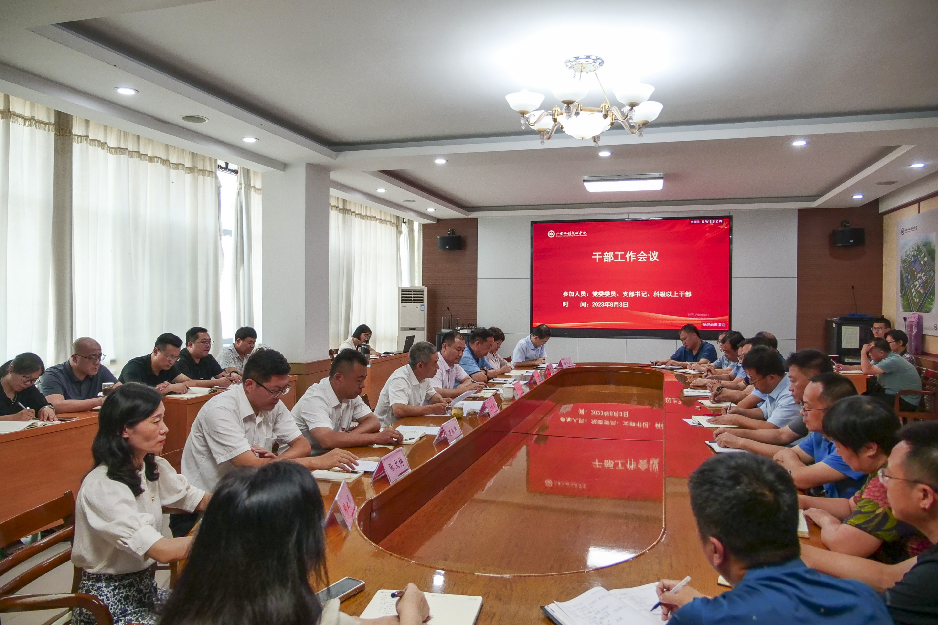 8月3日,山东水利技师学院召开干部工作会议,传达省水利厅党组的干部任免决定。会议由学院党委书记于福春主持,省水利厅人事处副处长郑学起出席,学院党委成员、支部书记、科级以上干部参会。
