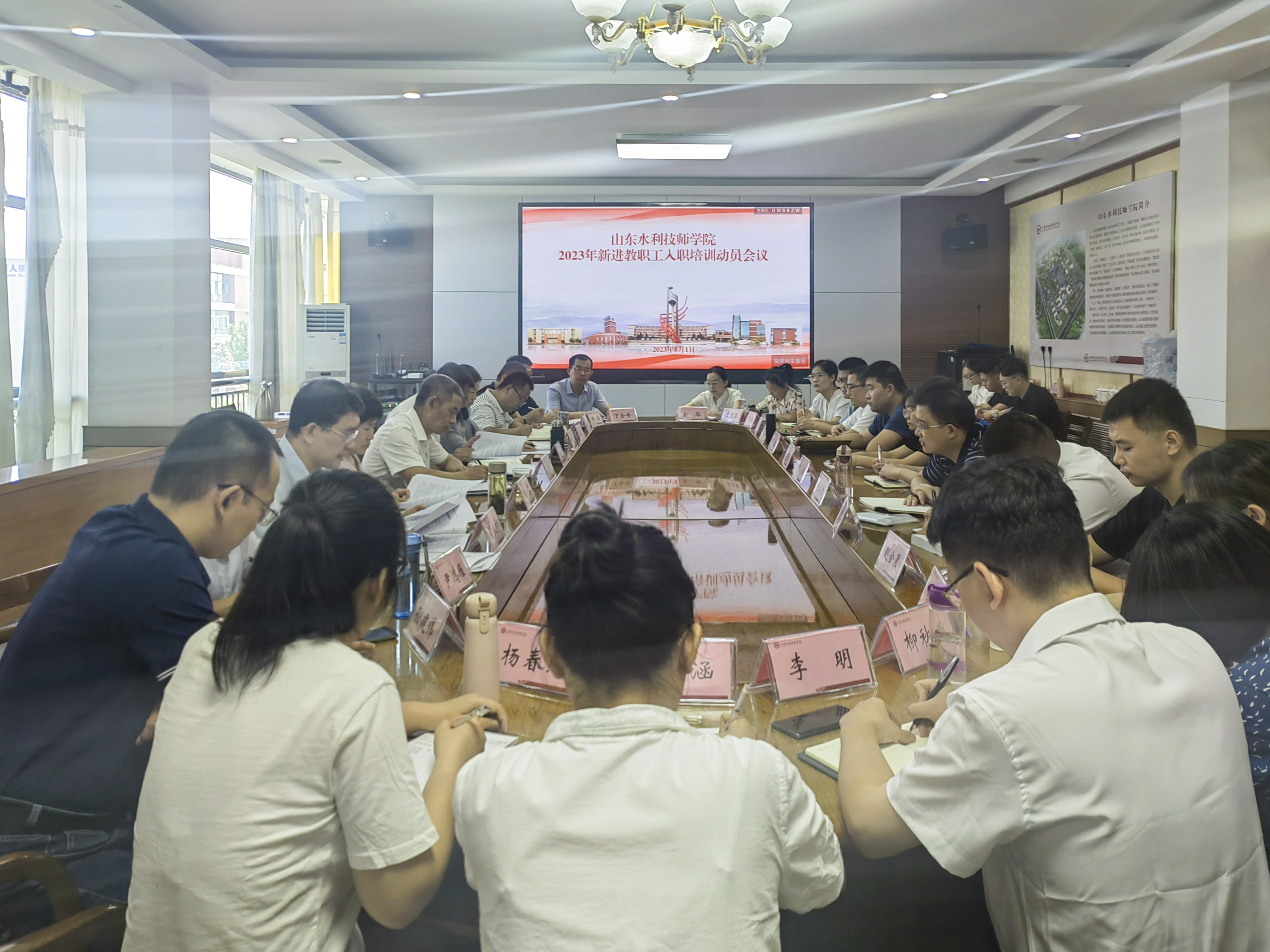 8月1日,山东水利技师学院召开2023年新进教职工入职培训动员会议,引导新进教职工迅速转变角色,逐步适应工作岗位。学院党委书记于福春出席并讲授开班第一课,院长边敦典出席会议,有关部门负责人参加会议。