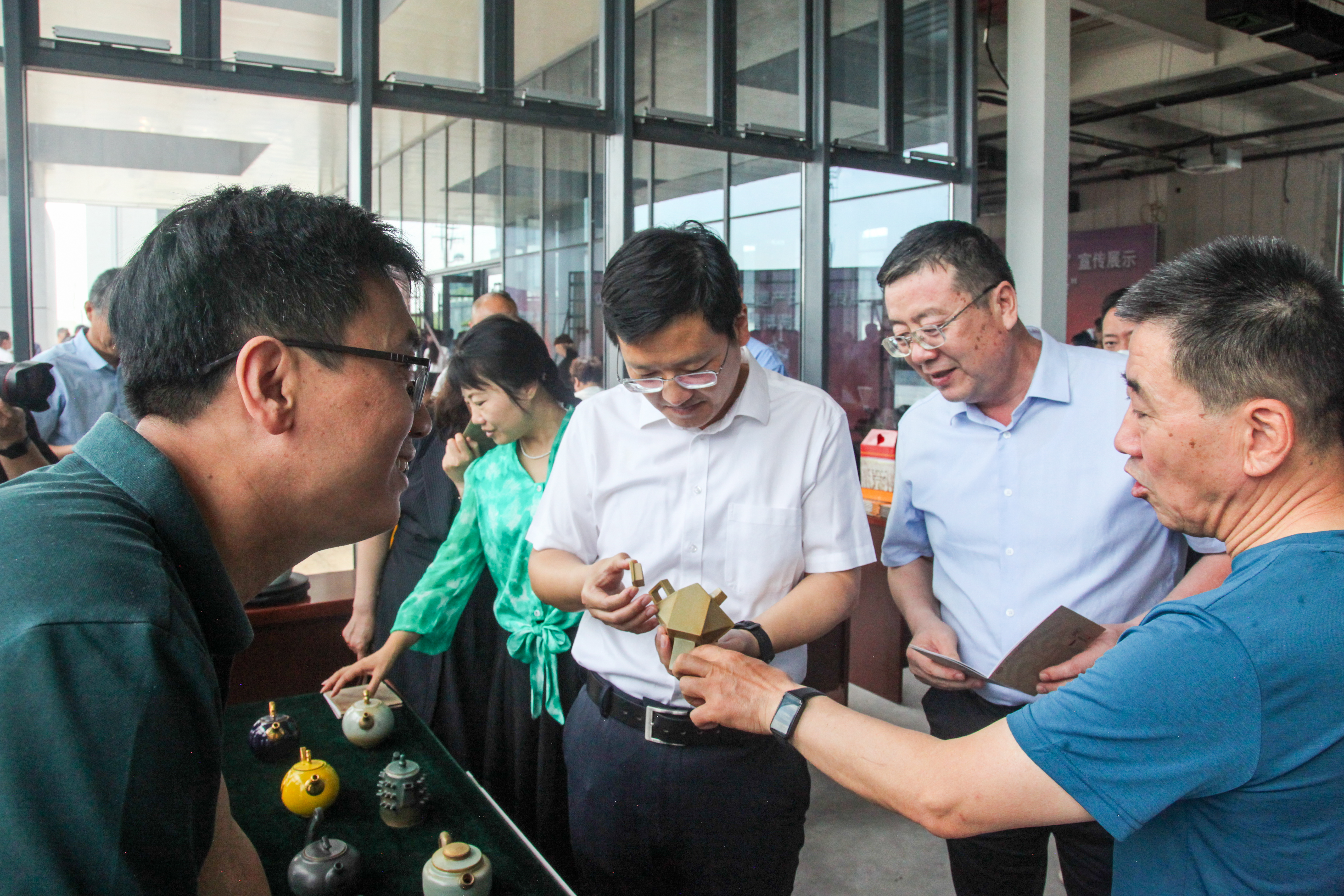 淄川区区委常委、副区长孙鹏伟和淄川区文旅局党组书记、局长高锟长等对学院参展的齐文化、水文化陶瓷作品很感兴趣。