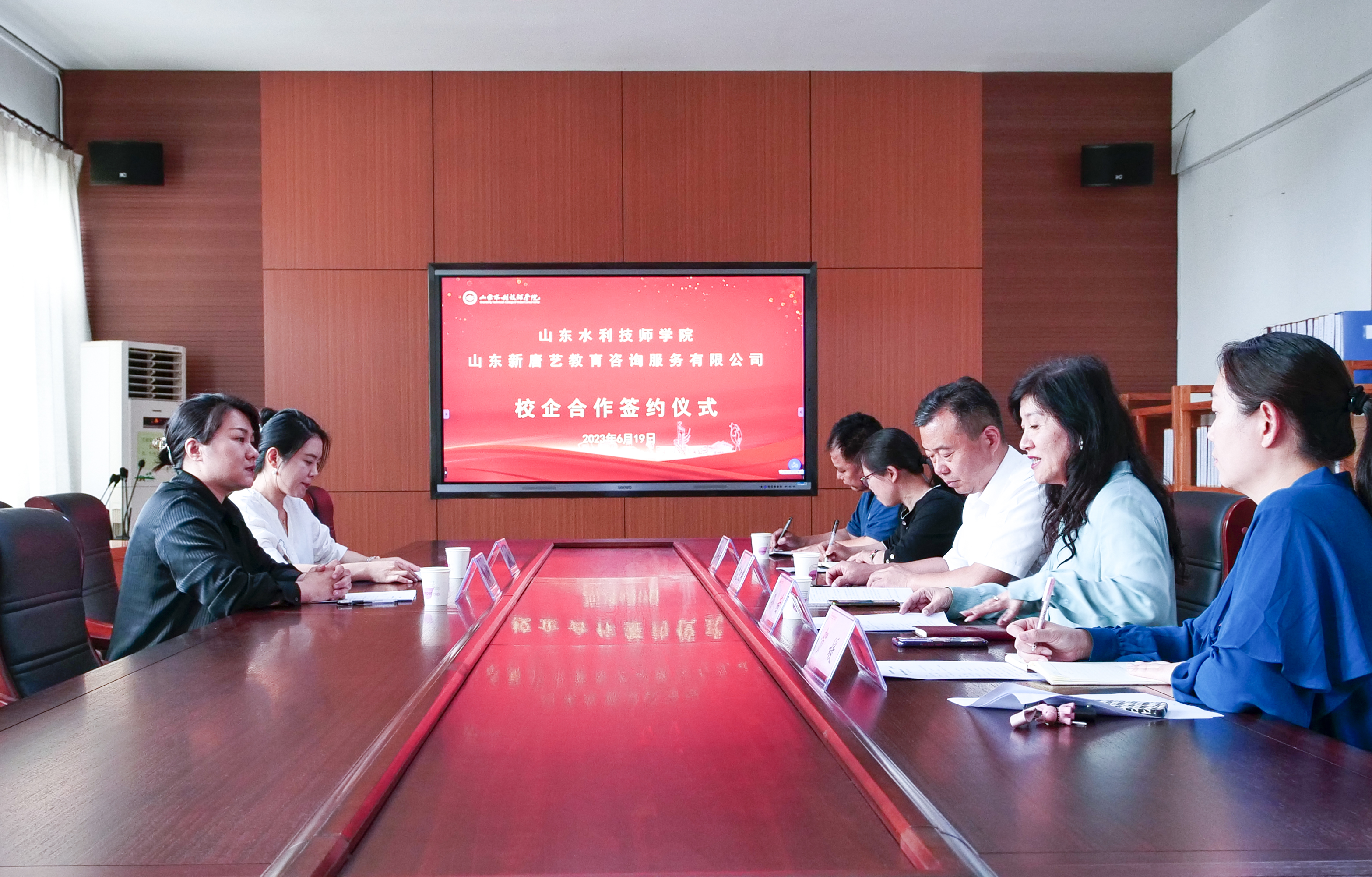 6月19日,山东水利技师学院与山东新唐艺教育咨询服务有限公司举行校企合作签约仪式。学院院长边敦典、该公司总经理李阳及校企相关人员参加签约仪式。
