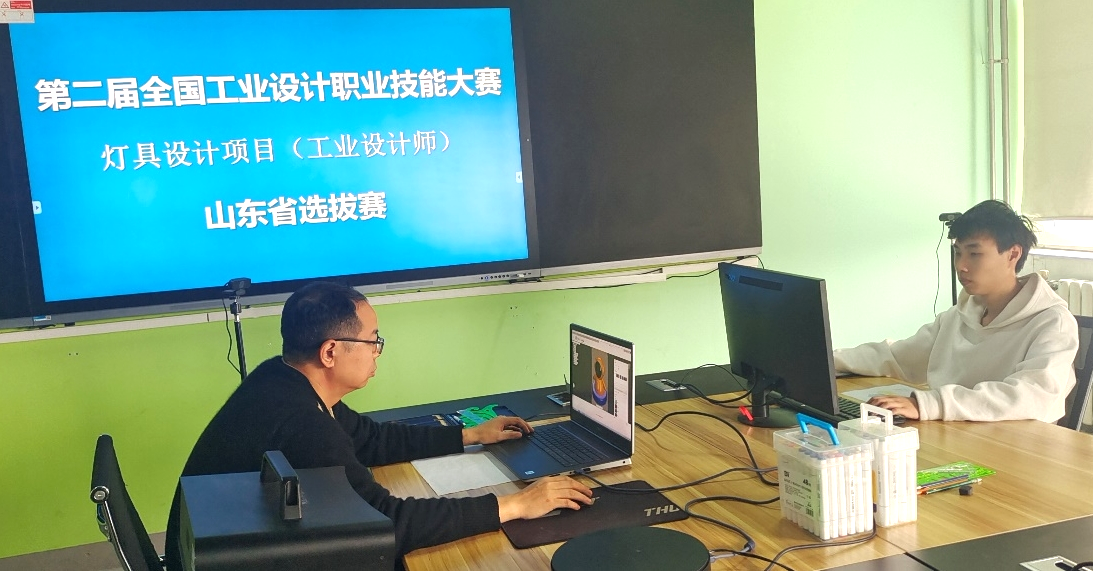 本次比赛为省级一类竞赛,由山东省人力资源与社会保障厅、山东省总工会主办,主要考核选手通过应用工业设计协同创新平台,根据灯具行业发展最新动态,完成灯具的概念草图设计、三维造型及工程设计、产品装配与输出、快速原型制造、产品可视化与展示等方面的能力。因为疫情原因,比赛改为线上,分为职工组和学生组两个组别。比赛过程中,学生组选手韩子正表现可圈可点,稳定发挥,以总成绩大幅领先的优势斩获学生组第一名。教师组选手杨兴民获得第二名,根据大赛奖励规定,杨兴民可申请“山东省技术能手”称号。