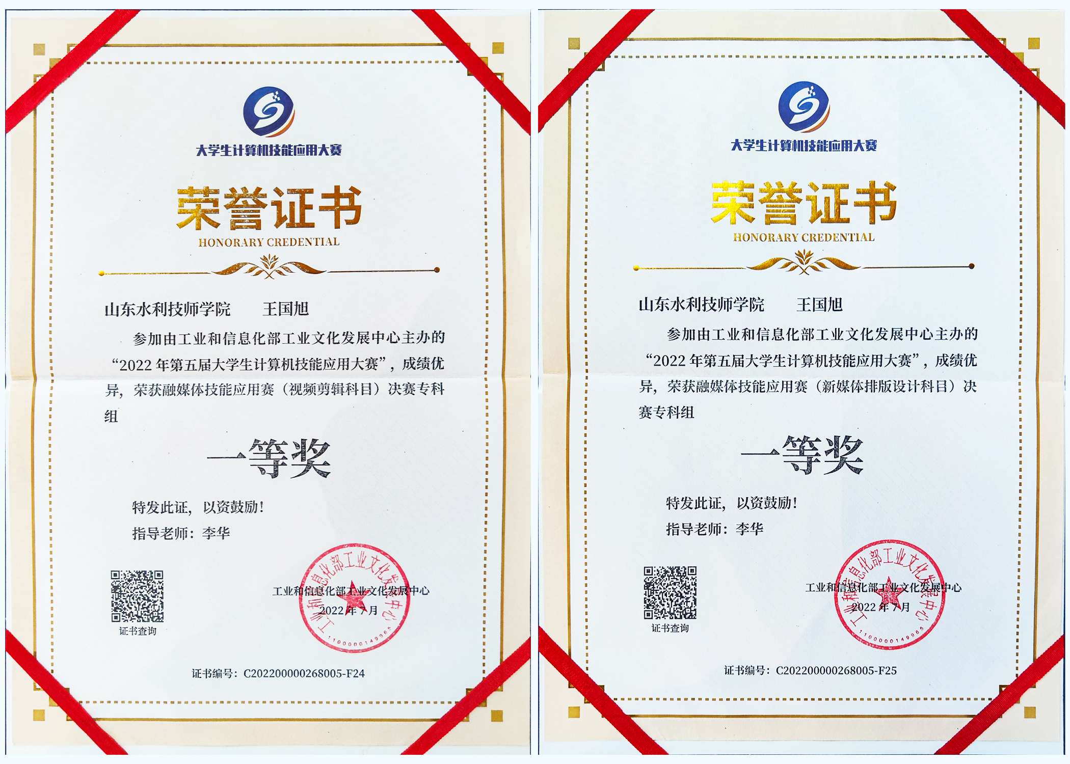 近日,由工业和信息化部工业文化发展中心主办的“第五届全国大学生计算机技能应用大赛”落下帷幕,山东水利技师学院学生王国旭,作为唯一一名进入决赛的技师学院选手,一举斩获融媒体视频剪辑项目、新媒体排版设计项目两个赛项(专科组)第一名的好成绩。