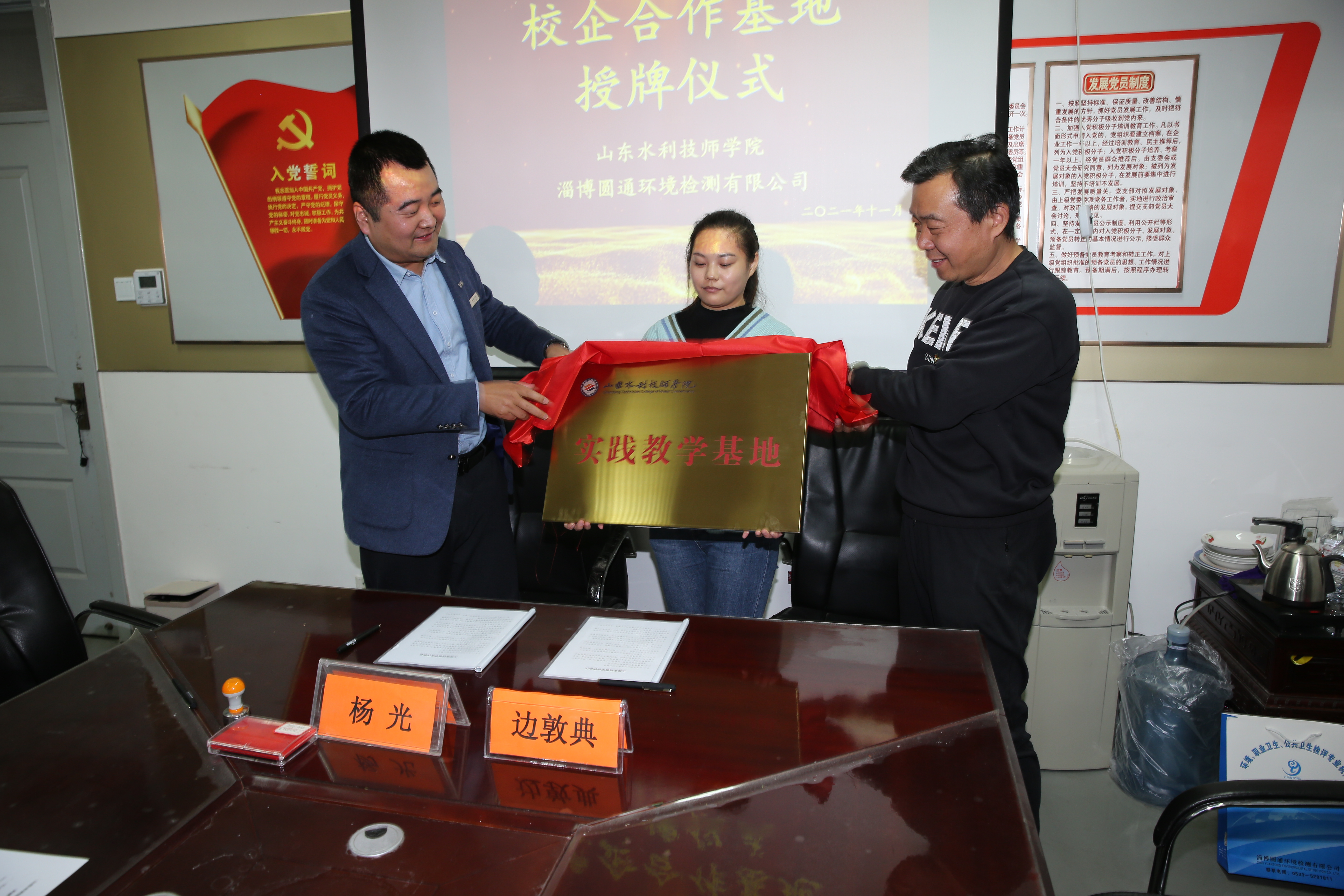 2021年11月26日,山东水利技师学院与淄博圆通环境检测有限公司举行校企合作实践教学基地签约授牌仪式。学院边敦典副院长与淄博圆通环境检测有限公司杨光总经理签定共建“实践教学基地”合作协议。