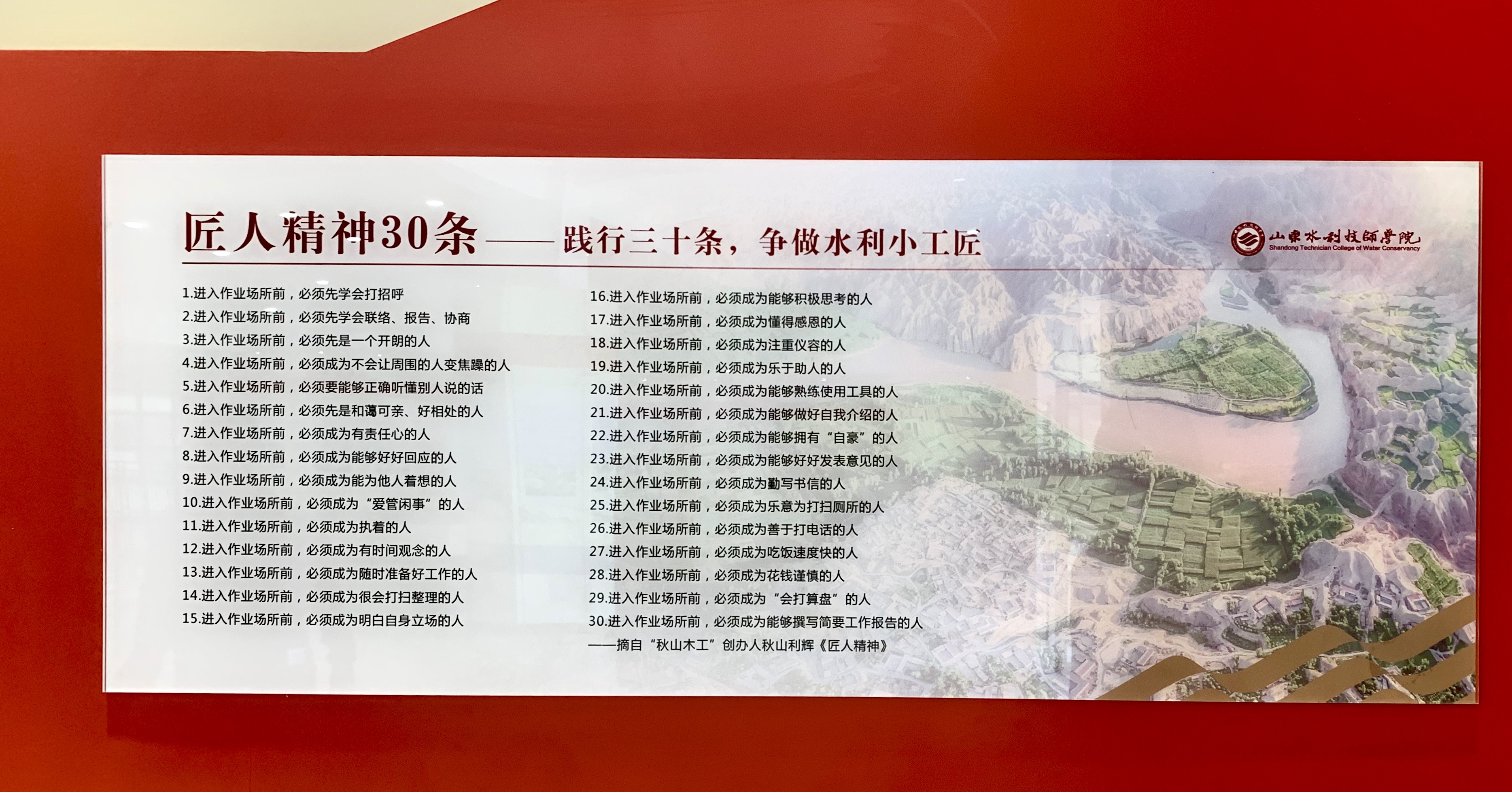为让新生深刻理解工匠精神,激发技能学习热情,树立技能报国志向,8月下旬,学院将获得“山东省技术能手”的13位教师和15位优秀学生(毕业生)的竞赛荣誉制成形象展板,陈置于学院图书楼、招生大厅、各系部教学楼门厅等重要场所,让新生们目光所及,学有目标,行有示范,时刻感受到榜样就在身边的鞭策与荣耀。各系部还将《匠人精神》一书中提到的30条育人法则上墙入教,立求将无处不在的工匠精神深深植根于新生们的心中,确保他们上好“匠心”第一课,为新学期的学习生活做好奋斗规划。