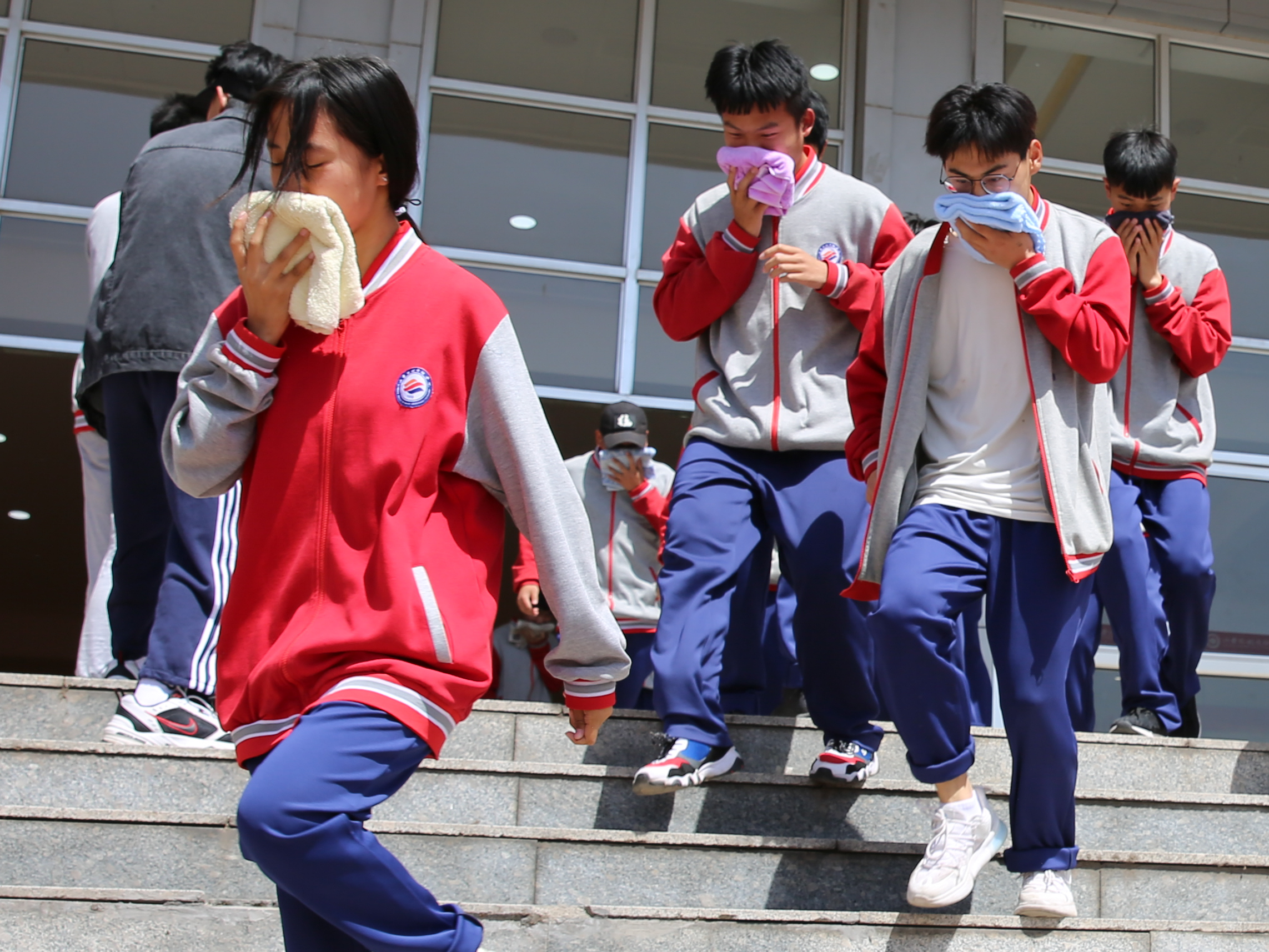 14时整,随着杨敬涛一声令下,演练正式拉开序幕。演练模拟学校人员密集场所和高层建筑发生火灾的情形,在淄博蓝盾安保服务有限公司应急救援队的指导和联合行动中,参训师生就报警、疏散、逃生、救助等相关环节进行了演练。