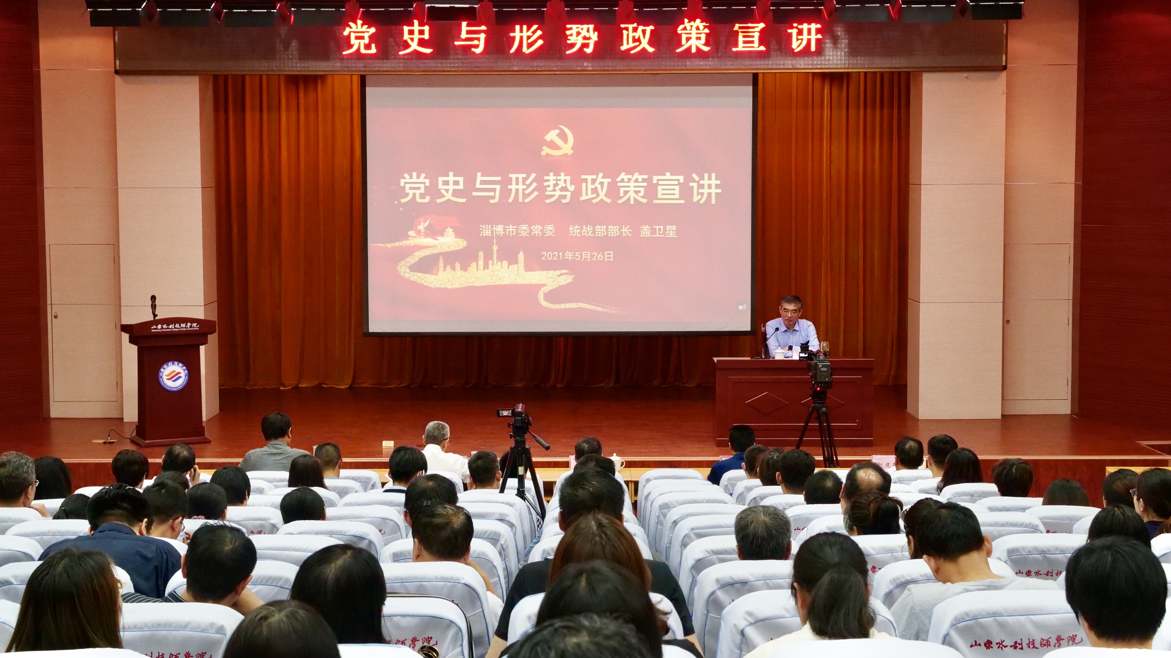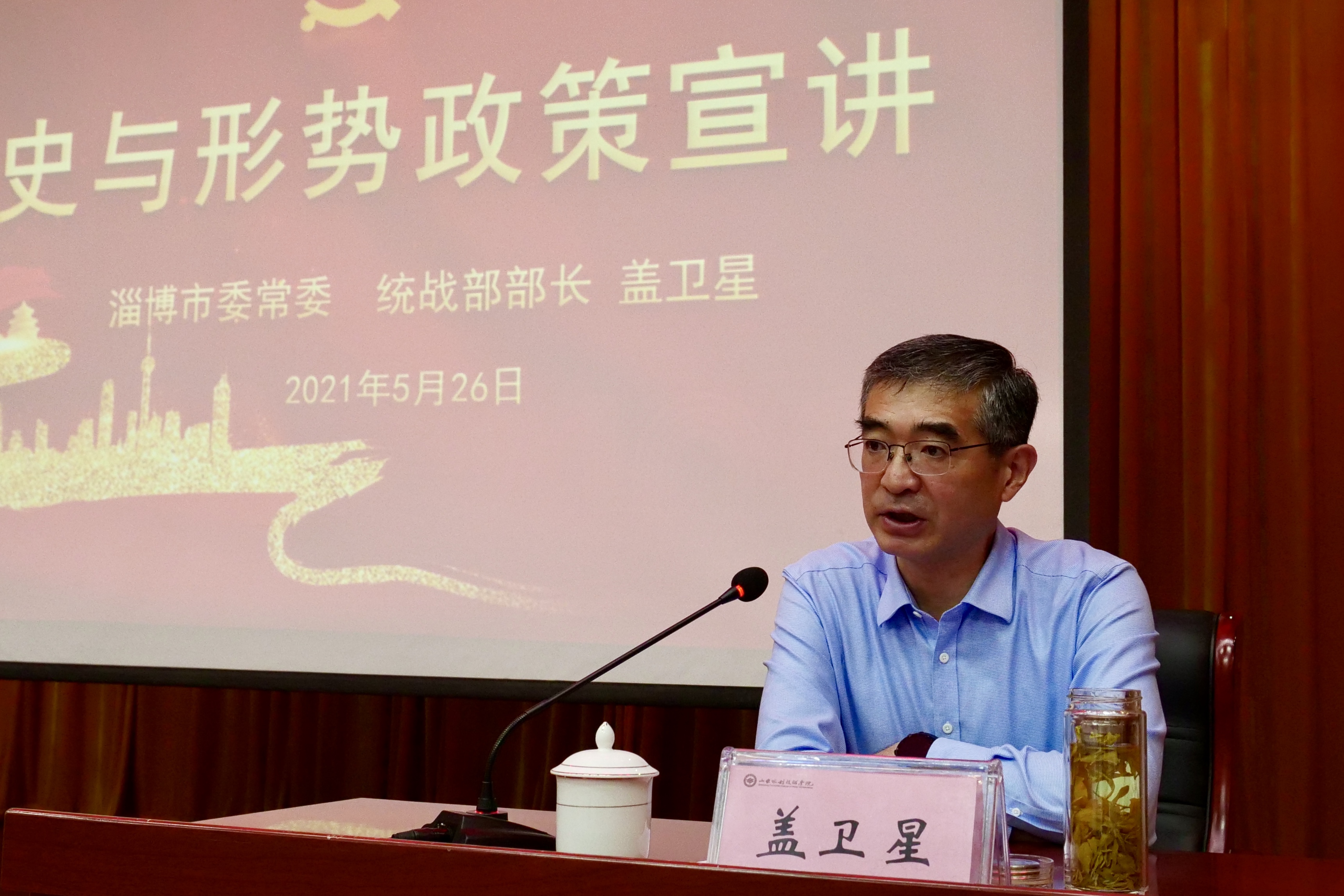 5月26日,淄博市委常委、统战部部长盖卫星到山东水利技师学院开展党史学习教育专题宣讲暨形势政策报告。山东水利技师学院党委书记于福春主持会议。