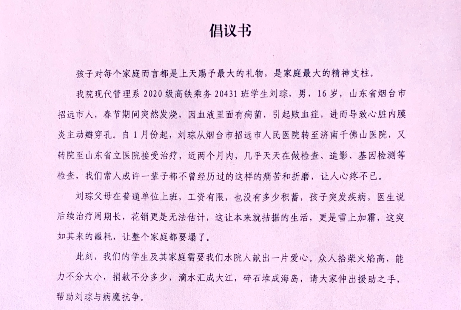 春节期间,刘琮突然发烧。经查,系血液里面有病菌,引起败血症,进而导致心脏内膜炎主动瓣穿孔。自1月份起,刘琮便辗转多家医院,最终至山东省立医院接受治疗。近两个月内,几乎天天要做造影、基因检测等检查。这些常人或许一辈子都不曾经历过的痛苦折磨,让他的父母看在眼里疼在心底。而几十万元的巨额医疗费,更是让这个经济本就不宽裕的家庭雪上加霜陷入困境。