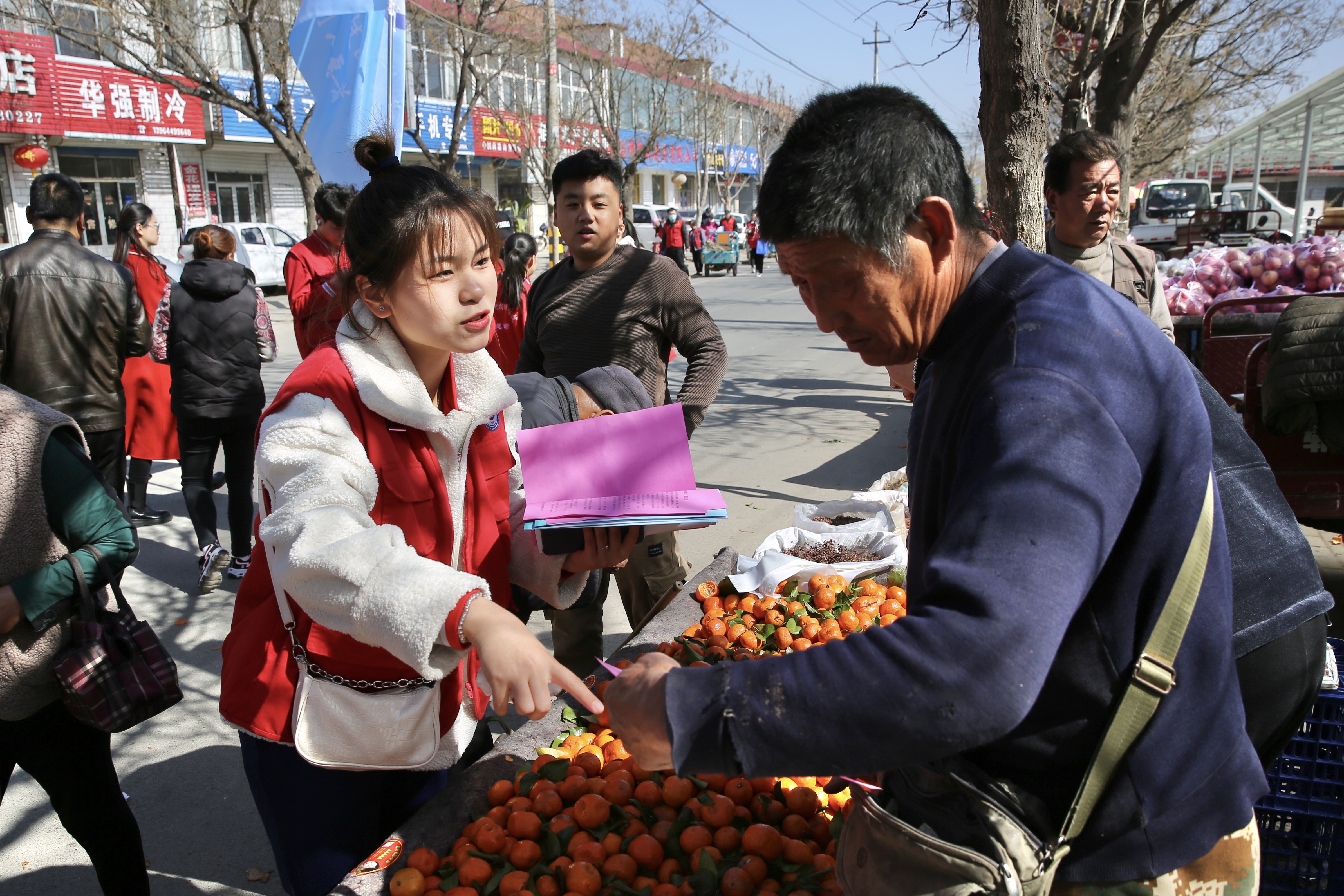 抵达太河镇,恰逢东同古村大集。我们二十位志愿者马不停蹄来到集市上,向穿梭其间的村民发放节水宣传单页,讲解宣传内容,介绍节水小知识。