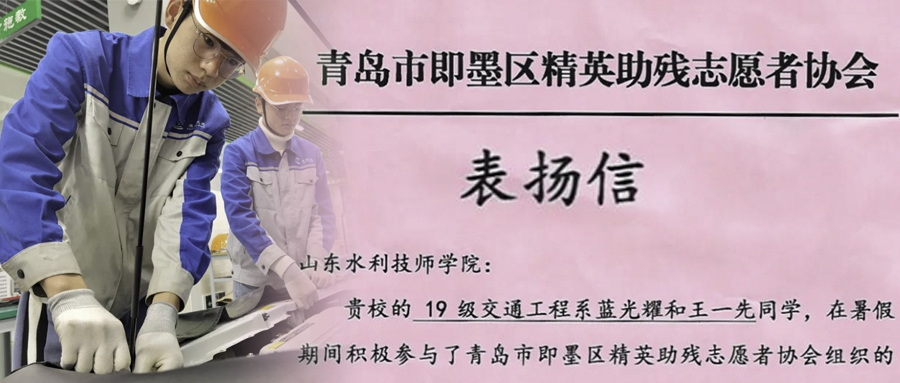 2020年9月初,一封由青岛市即墨区残疾人联合会和青岛市即墨区精英助残志愿者协会共同发出的表扬信,寄到山东水利技师学院,学院交通工程系学生王一先和蓝光耀利用暑假“传承爱心接力助残”的爱心事迹,方被广大师生所知悉.