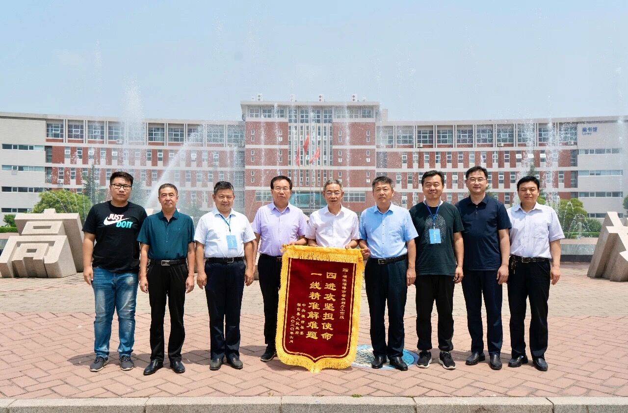 2020年6月10日,淄博市桓台县政协主席高连义、副县长赵曰珠、县教育局局长祁志超和县水利局局长郭亮等一行来到山东水利技师学院,代表中共桓台县委和县人民政府赠送“四进攻坚担使命,一线精准解难题”锦旗,感谢由学院党委书记于福春任组长,副院长边敦典任组员的“四进”工作组在疫情防控期间为桓台县作出的特殊贡献。