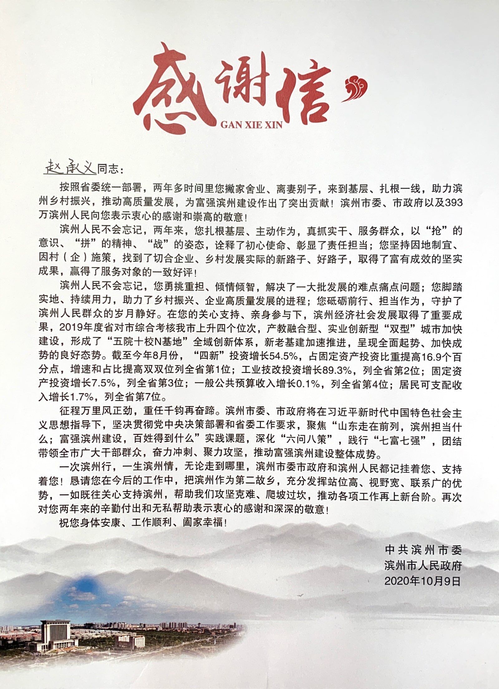 2018年9月26日,学院总务处副处长赵承义积极响应上级号召,成为省委“千名干部下基层”乡村振兴服务队的一员,被派驻滨州市惠民县淄角镇进行帮扶工作。两年的奋斗时刻未停,两年的变化日新月异。挂职期满时,赵承义收到了滨州市委、市政府的感谢信,并被惠民县委、县政府荣记三等功。