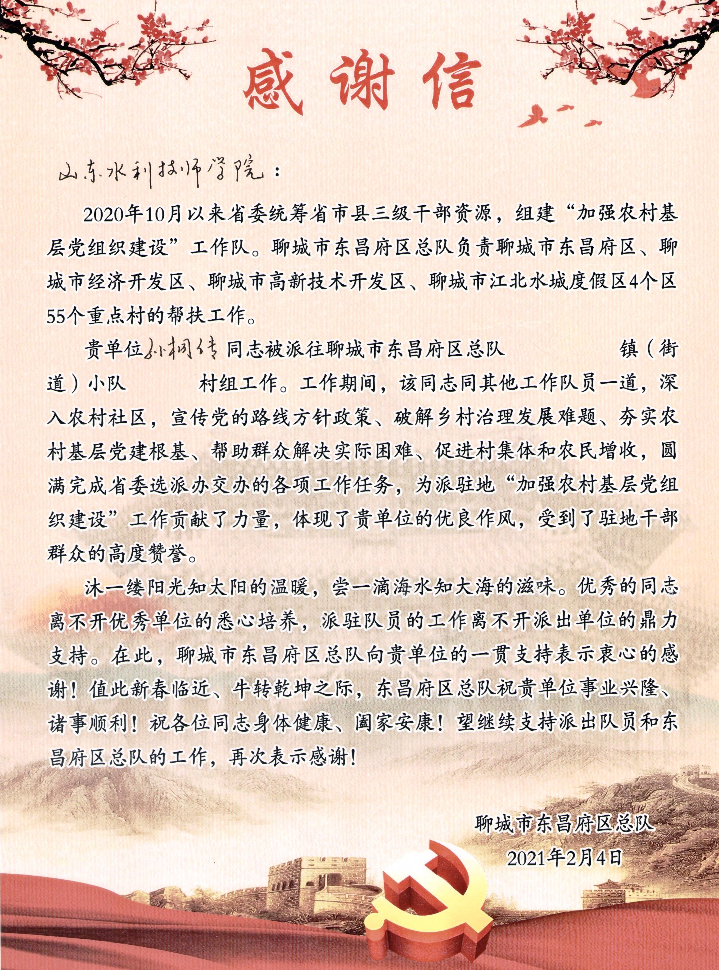 2月3日—4日,山东水利技师学院接连收到了省委“加强农村基层党组织建设”工作队聊城市东昌府区总队和中共沂源县委、沂源县人民政府发来的感谢信,一致表达对学院“用汗水浇灌收获、以实干笃定前行”认真履职的工作态度的高度认可。