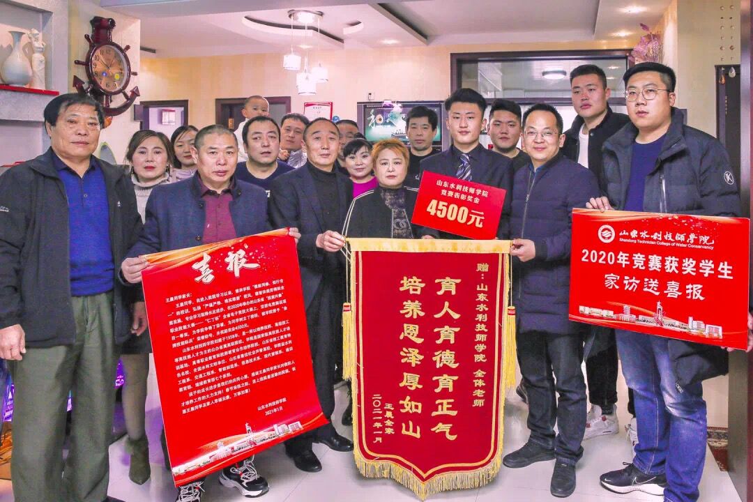 2021年1月11日至13日,山东水利技师学院一年一度的家访送喜报活动如期展开。1月11日一早,学院荣获2020年山东省“技能兴鲁”职业技能大赛——“仁丁杯”全省电子竞技大赛“电竞解说”项目一等奖的学生王晨,甫一看到老师到来,随即与家长一起快步迎上,将一面绣有“育人育德育正气,培育恩泽厚如山”的锦旗送到他们手中,表达对学院悉心教导的深深感谢。