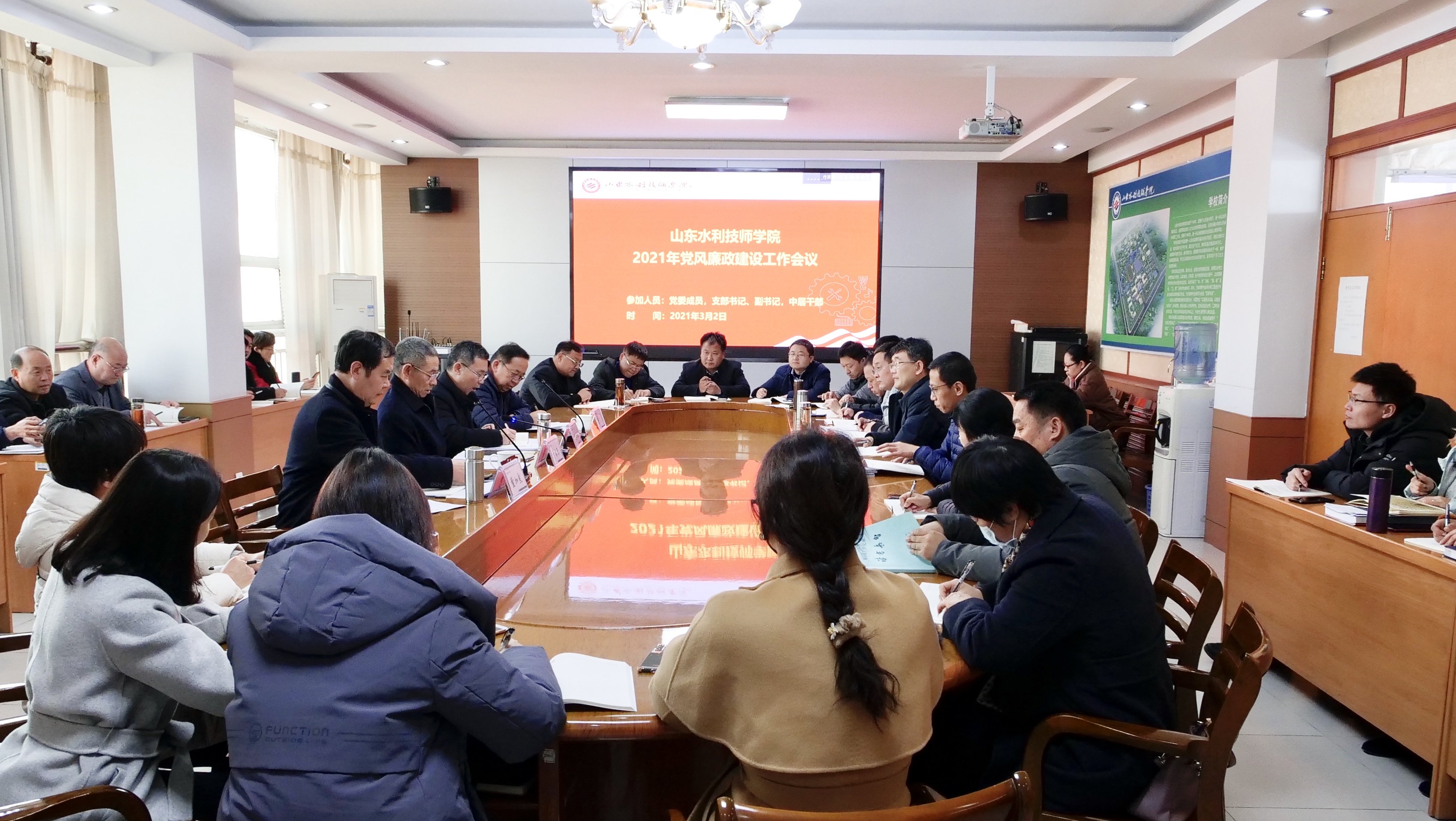 3月2日,山东水利技师学院召开2021年党风廉政建设工作会议,总结学院2020年党风廉政建设工作,部署2021年工作任务。党委书记于福春作《深入推进全面从严治党 深入推进党风廉政建设 以强有力的政治监督护航学院发展》主题讲话,学院领导班子成员出席会议,各支部书记、副书记,全体中层干部参加会议。