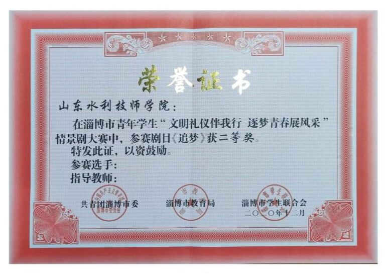 12月11日,山东水利技师学院金浩然、李晓文等11名学生参加了由共青团淄博市委、淄博市教育局、淄博市学生联合会举办的全市青年学生情景剧大赛决赛。