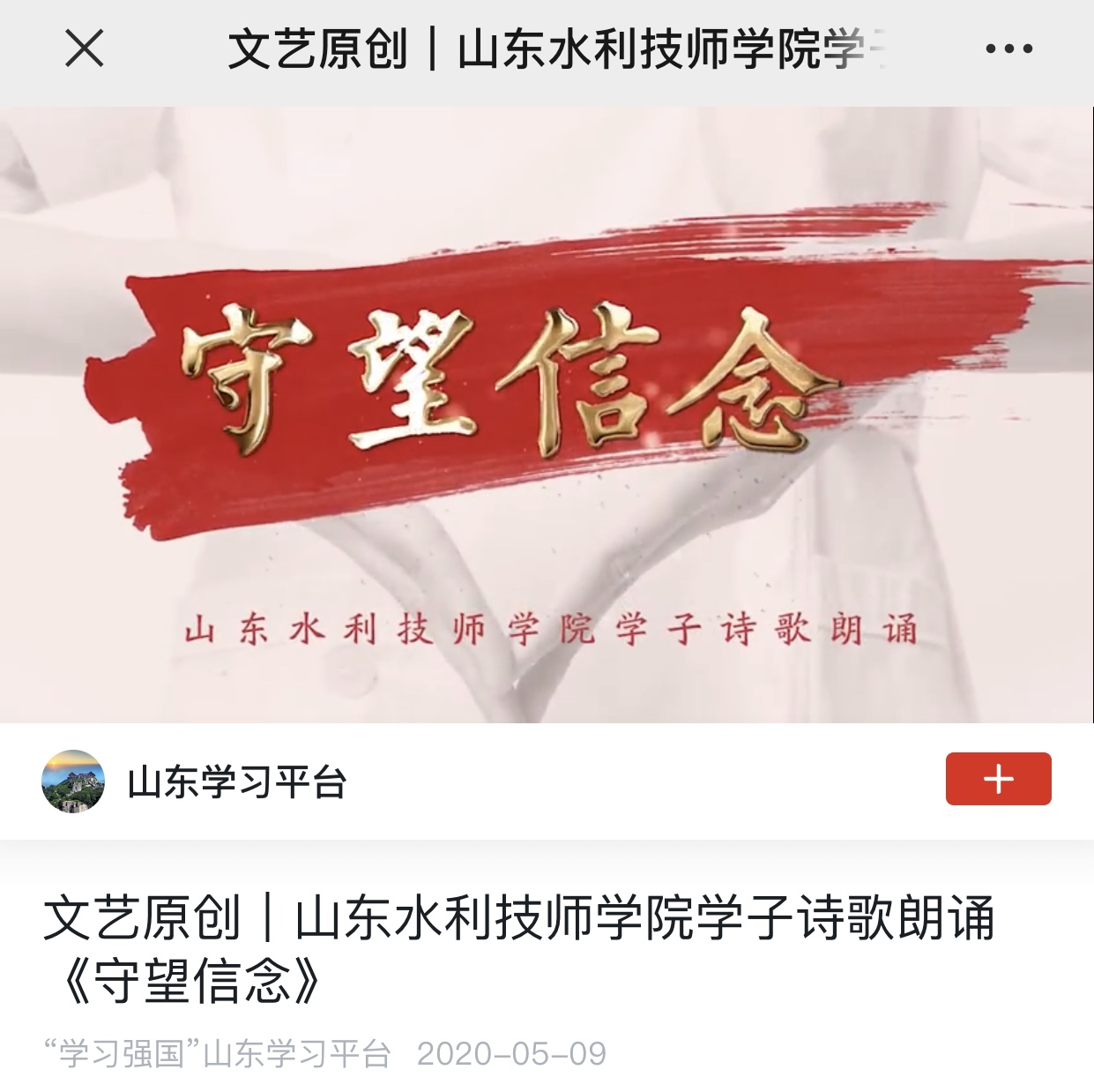 5月4日,水院学子用诗歌朗诵《守望信念》表达对祖国的热爱,对学院的深情——表达水院人在疫情期间坚守岗位,爱心捐助,网课不停,助力复工,服务社会,勇于担当,无私奉献的精神,水院青年人继承和发扬了“忧国忧民、热爱祖国、积极创新、探索科学”的五四精神——诗歌朗诵音视频被学习强国山东平台登发。