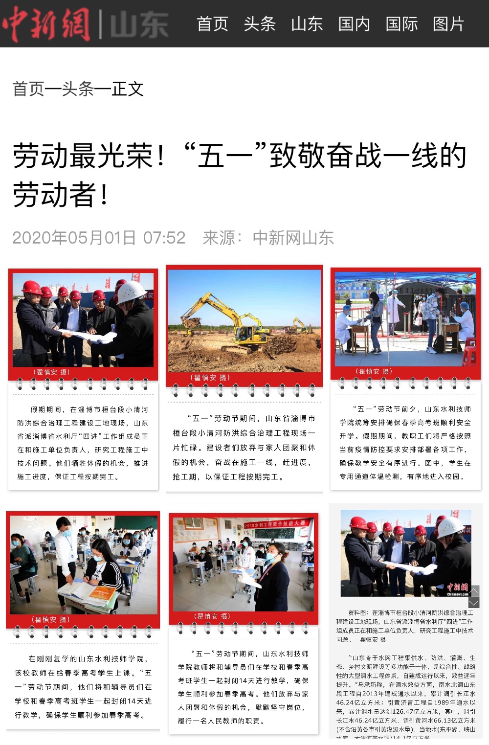 5.1劳动节期间,春考班师生们坚守在课堂,学院党委书记于福春带队淄博市省水利厅四进工作组在小清河防洪综合治理工程现场忙碌着赶工期。他们作为奋战一线的劳动者,登上中新网、大众网和大众日报等多家媒体。