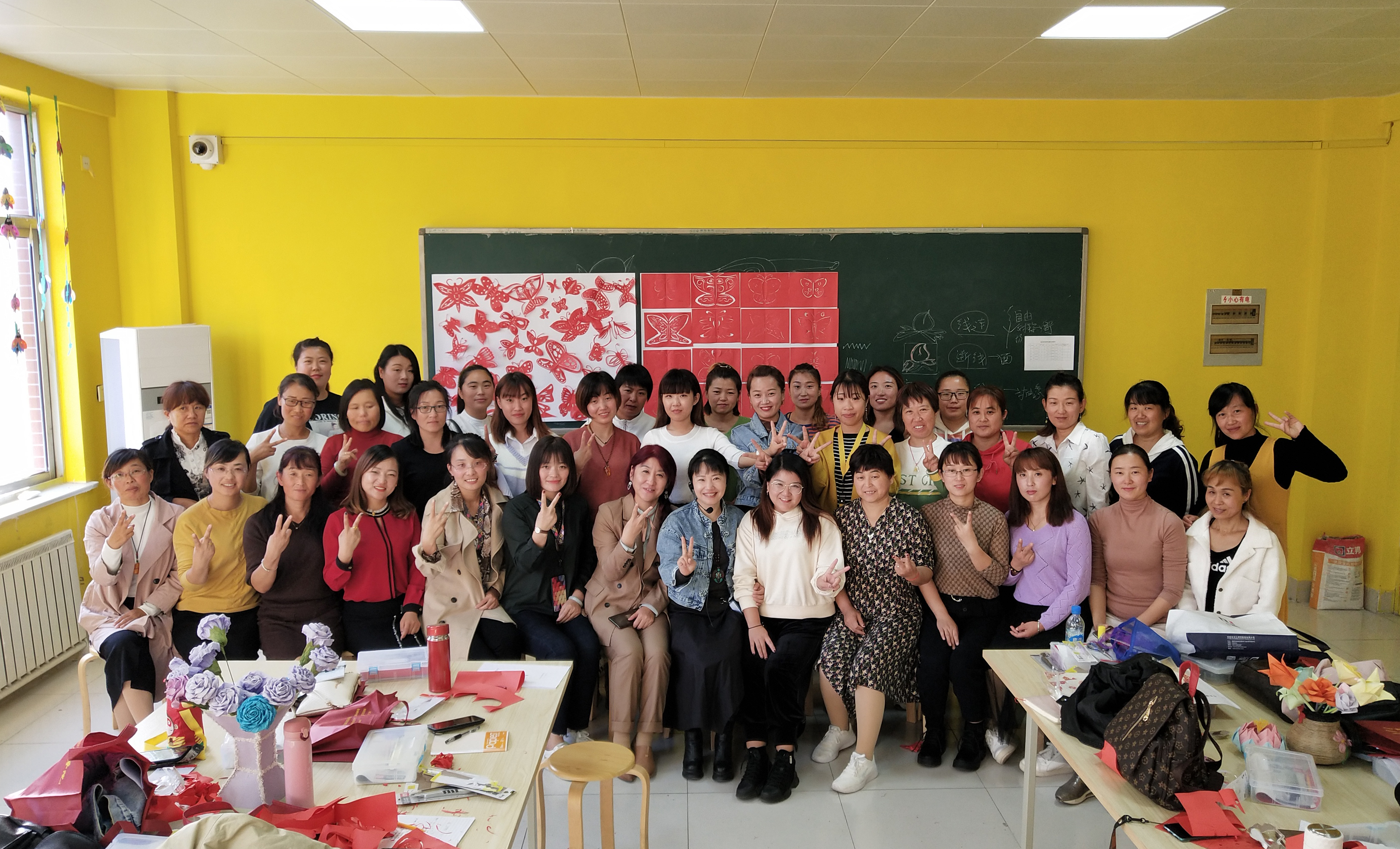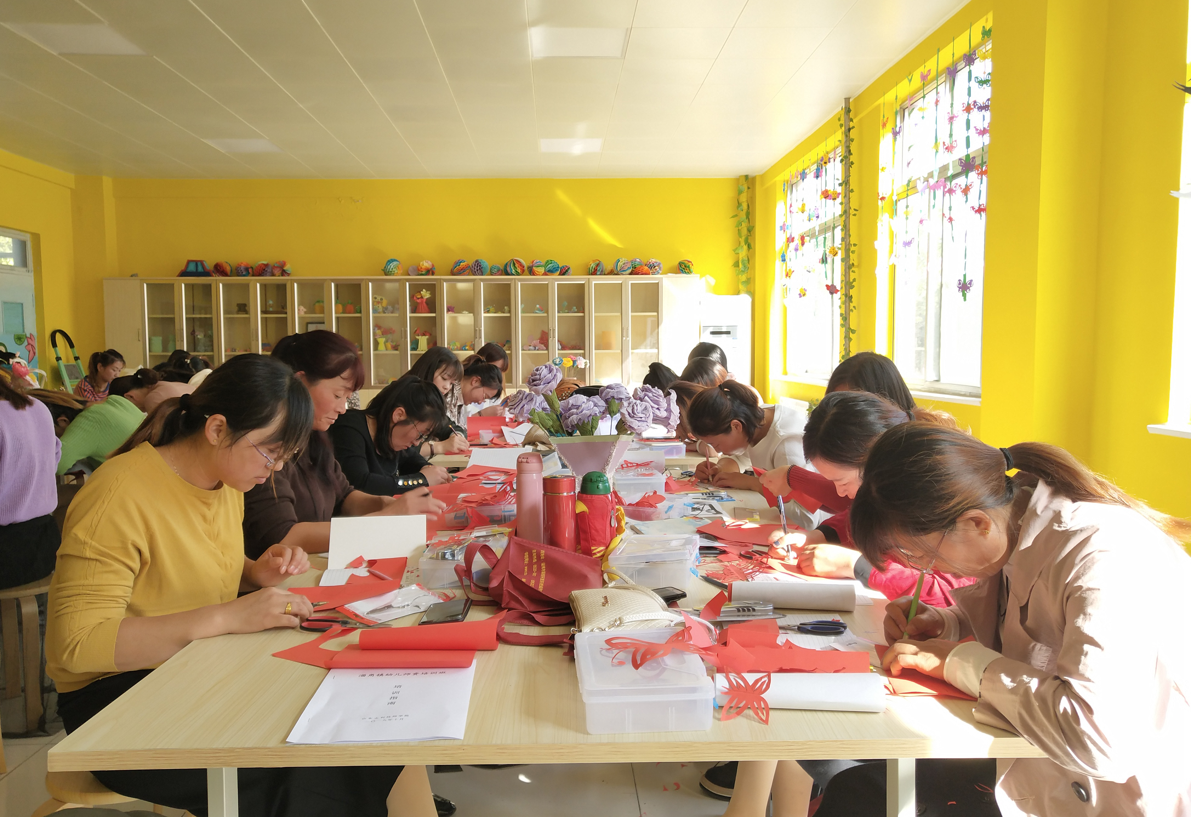 开班仪式结束后,全体参训教师在学院现代管理系手工实训室开始了培训第一课——手工剪纸。手工课是幼儿教育的一门重要课程,能锻炼孩子们的动手能力,增强想象力和自信心,使孩子们身心平衡发展。本次培训把手工作为第一课,学习剪纸艺术,是为了更好地贯彻落实习近平总书记的指示,继承和弘扬中华民族优秀传统文化,推动优秀传统文化在新时代发扬光大。本次教授剪纸艺术的李华老师传承家门,对剪纸技法和剪纸艺术有多年研究,造诣深厚。授课中,李老师介绍了剪纸艺术的渊源、发展和现状,阐释了剪纸作为民间艺术列为非物质文化遗产的重要性,并讲述了剪纸的基本技法,以阳剪和阴剪两种方式对比学习,手把手授课。培训的学员兴致浓厚,态度认真,在李老师的指导下,剪出了栩栩如生的作品。她们纷纷表示,一定好好珍惜这次学习机会,努力提升技能,为家乡的幼儿教育事业做贡献。