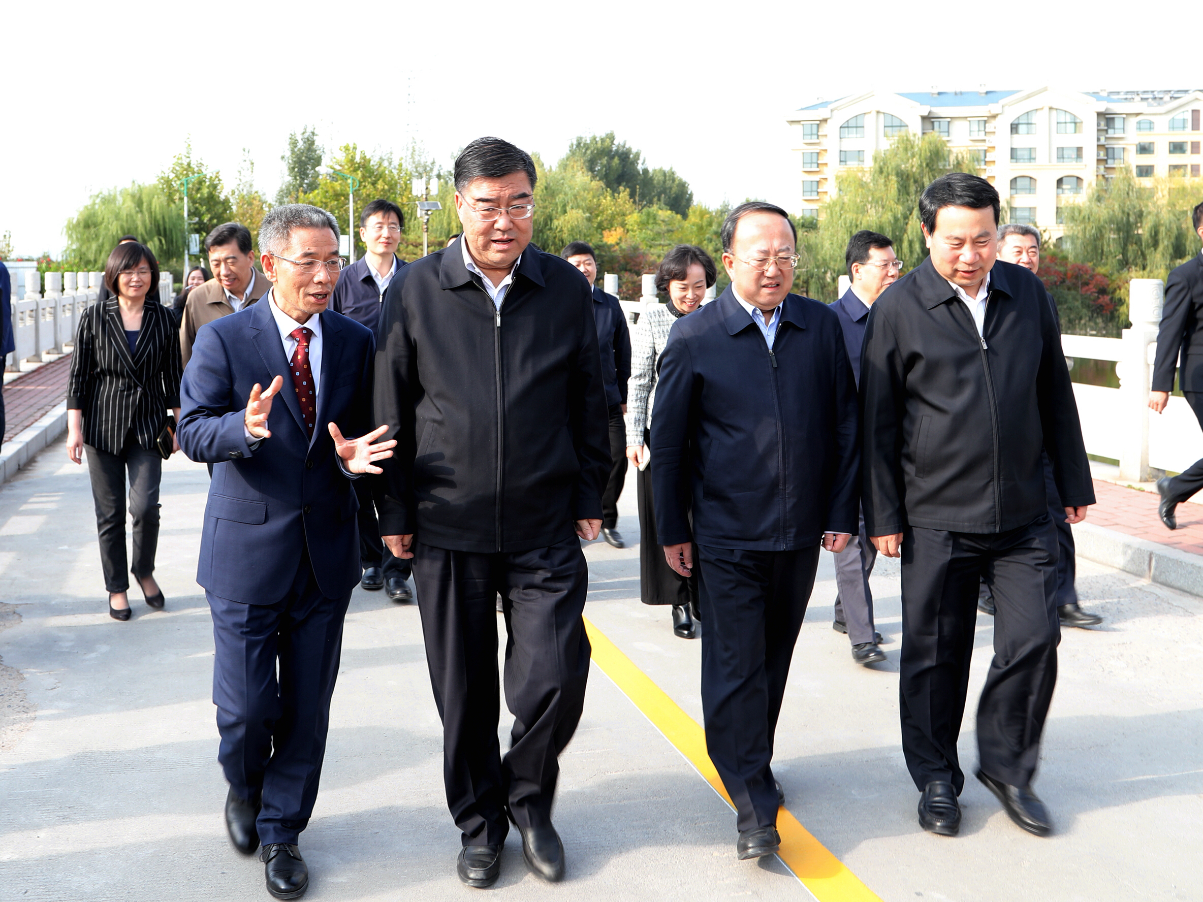 闭幕式结束后,水利部副部长田学斌、山东省副省长于国安、省水利厅厅长刘中会等领导视察了学院萌源河实体水工建筑物教学基地,调研了学院文化建设。