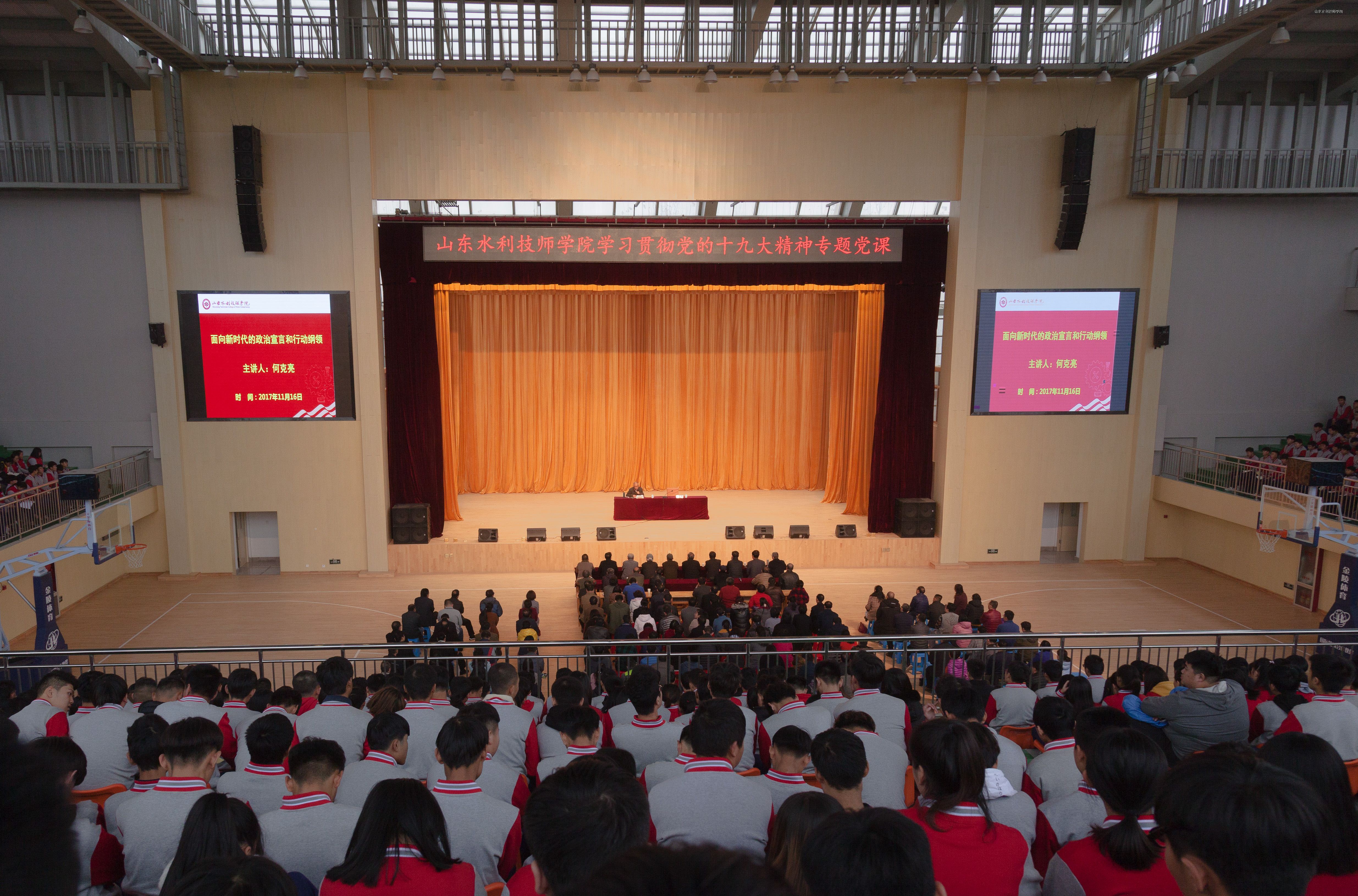 为及时准确地掌握十九大精神,激励广大师生不忘初心、牢记使命,不断提振精神状态,改进工作作风,深入推进“两学一做”学习教育常态化制度化,按照省水利厅《关于认真学习宣传贯彻党的十九大精神的实施意见》要求和学院党委的部署,11月16日下午,学院邀请山东省委讲师团原副团长何克亮教授在体育馆讲授了《面向新时代的政治宣言和行动纲领》专题党课。党课由学院党委书记于福春主持,全体教职工及部分离退休干部职工、学生代表1600余人参加了党课学习。