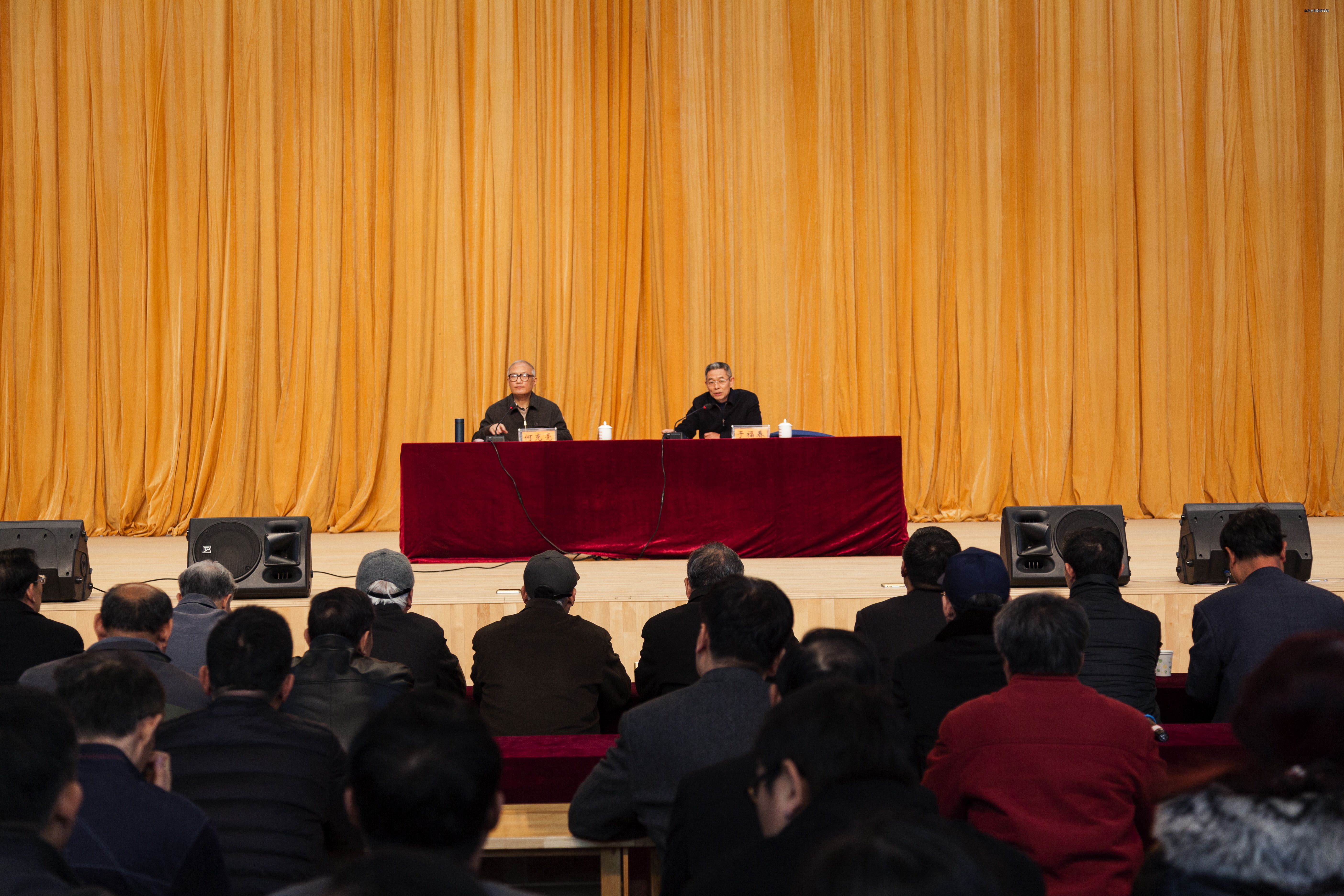 山东省委讲师团原副团长何克亮教授(主席台左一)讲授专题党课,学院党委书记于福春(主席台右一)主持