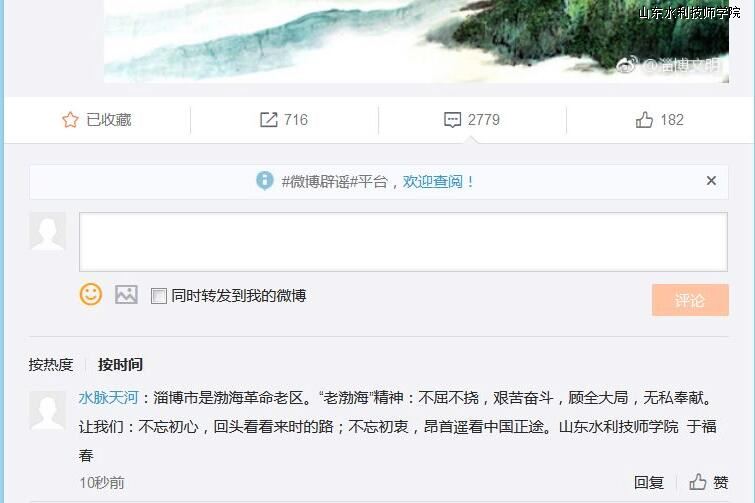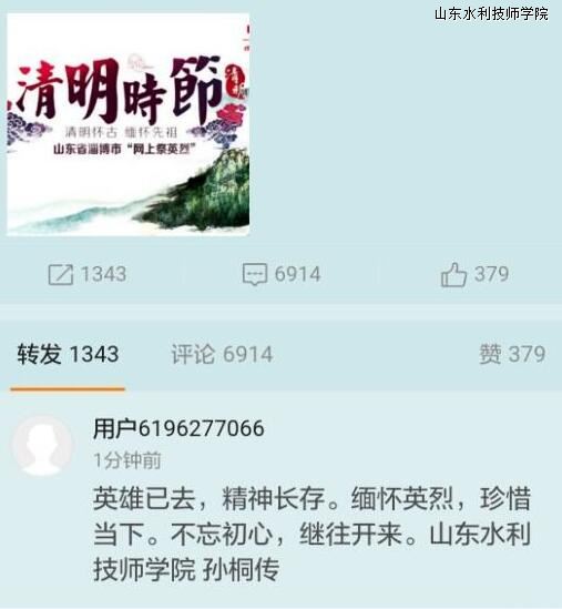 “淄博市是渤海革命老区。‘老渤海精神’:不屈不挠,艰苦奋斗,顾全大局,无私奉献。让我们不忘初心,回头看看来时的路;不忘初衷,昂首遥看中国正途。”学院党委书记于福春这样留言;“英雄已去,精神长存。缅怀英烈,珍惜当下。不忘初心,继往开来。”学院院长孙桐传这样留言;“爷爷是在1948年解放周村战役中牺牲的,所以清明祭奠英烈对我而言就有了更特殊的意义。爷爷牺牲时二十五岁,陵园里很多烈士也是二十岁左右牺牲的,为了我们的幸福生活,他们献出了年轻的生命。我们唯有加倍珍惜和感恩,好好生活,努力工作!”学院栾利香老师这样留言;“缅怀先烈,继承革命先烈遗志,就是要学好知识,用技能成就梦想,更好地报效祖国!”学生记者赵梦菊这样留言。“清明祭英烈”的网络留言区内,师生们争相留下自己的感言体会,表达敬仰和哀思,同时提醒自己继承先烈遗志、传承红色基因、弘扬优良传统。