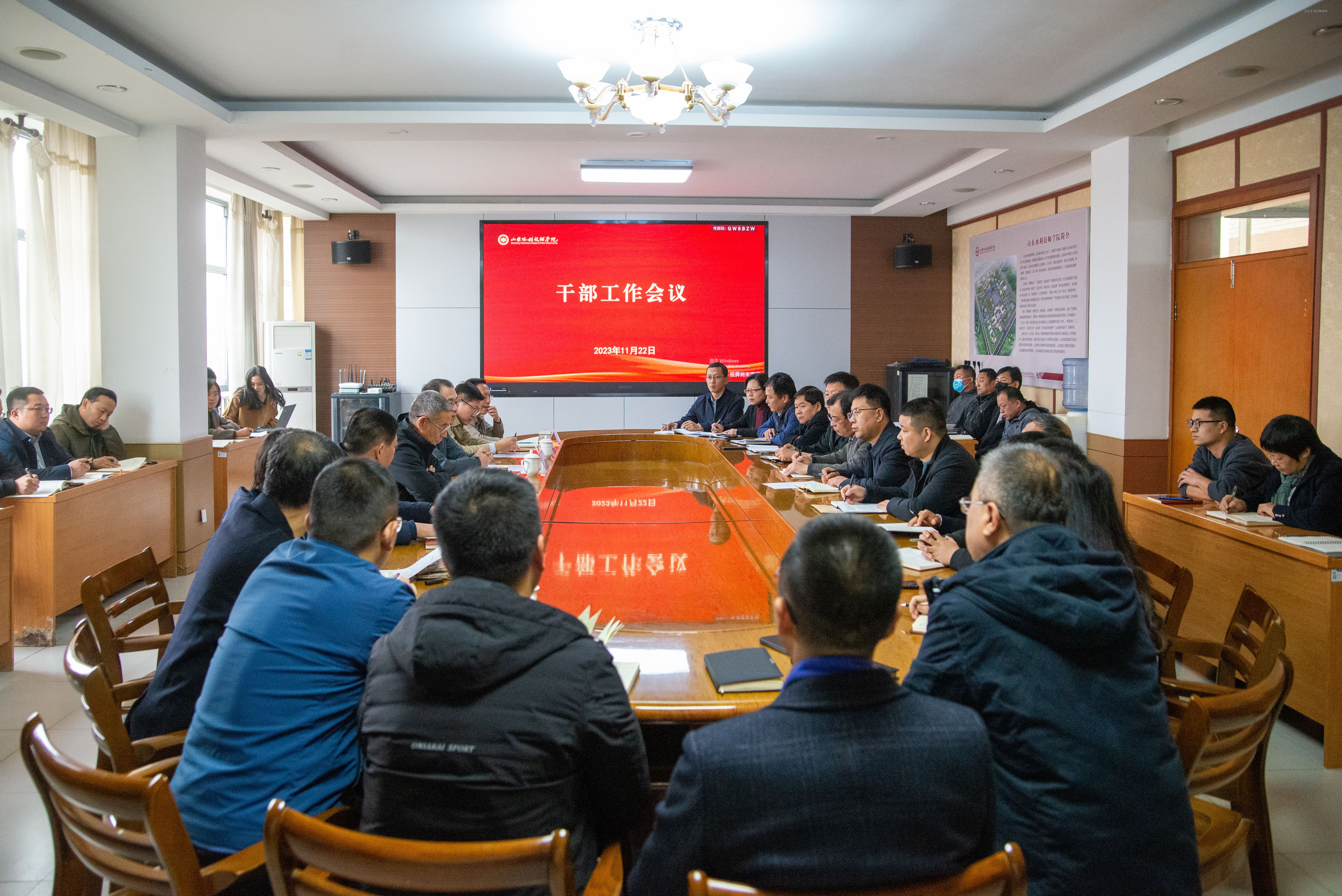11月22日,山东水利技师学院召开干部会议,传达省水利厅党组干部任职决定。学院党委书记于福春主持会议,省水利厅人事处二级调研员马成出席会议,学院党委成员,各党支部书记、副书记,全体中层以上干部参会。