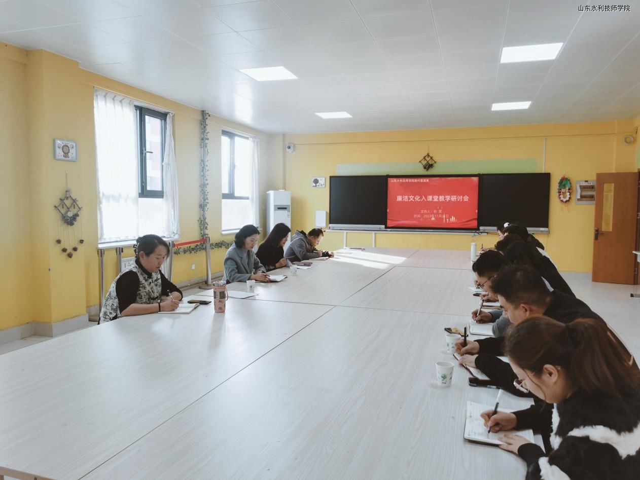 近日,山东水利技师学院现代管理系召开廉洁文化入课堂教学研讨会,学院副院长穆云丽到会指导,该系全体教师及美育教研室专兼职教师参会。