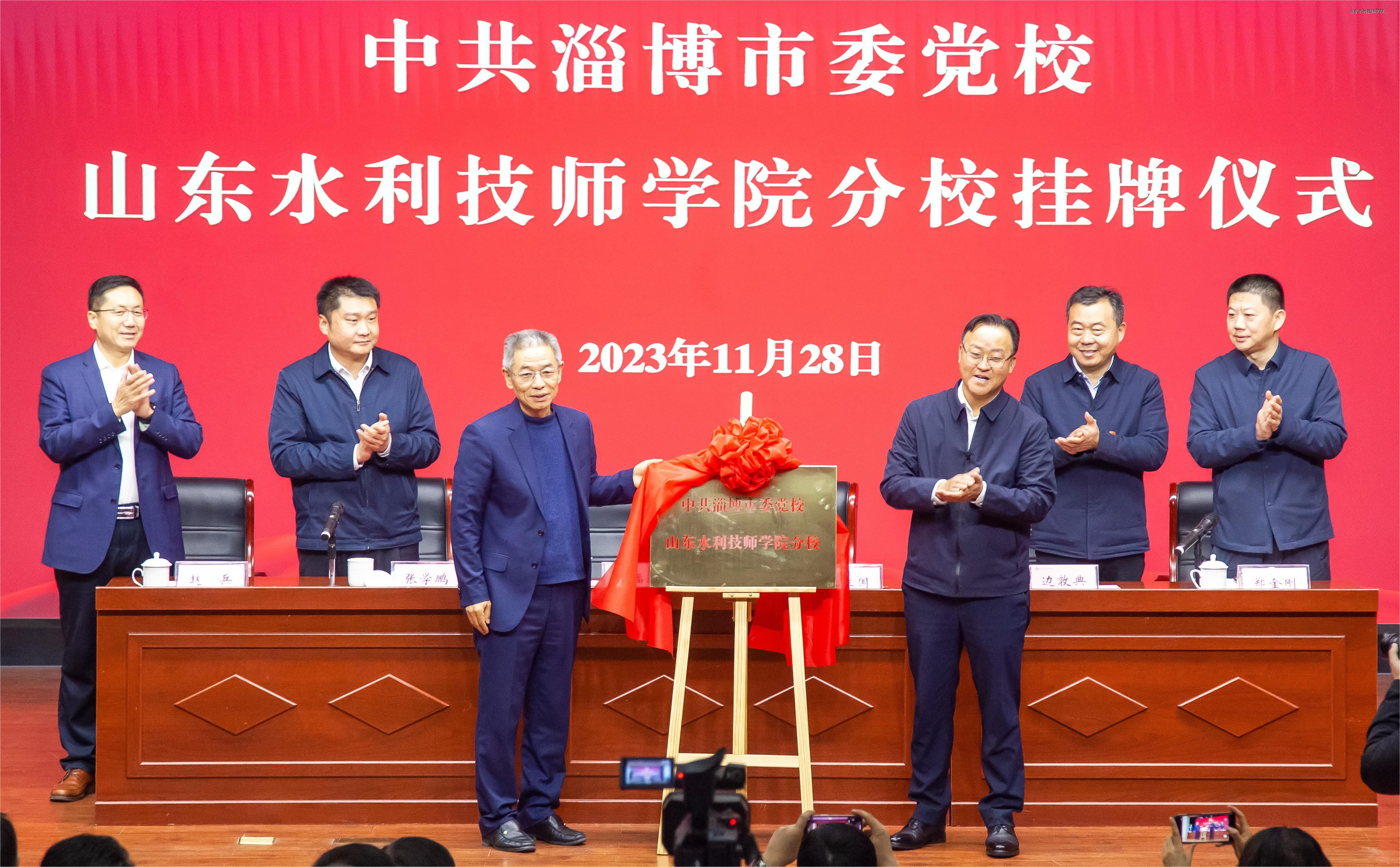 张立国、于福春共同为“中共淄博市委党校山东水利技师学院分校”揭牌。