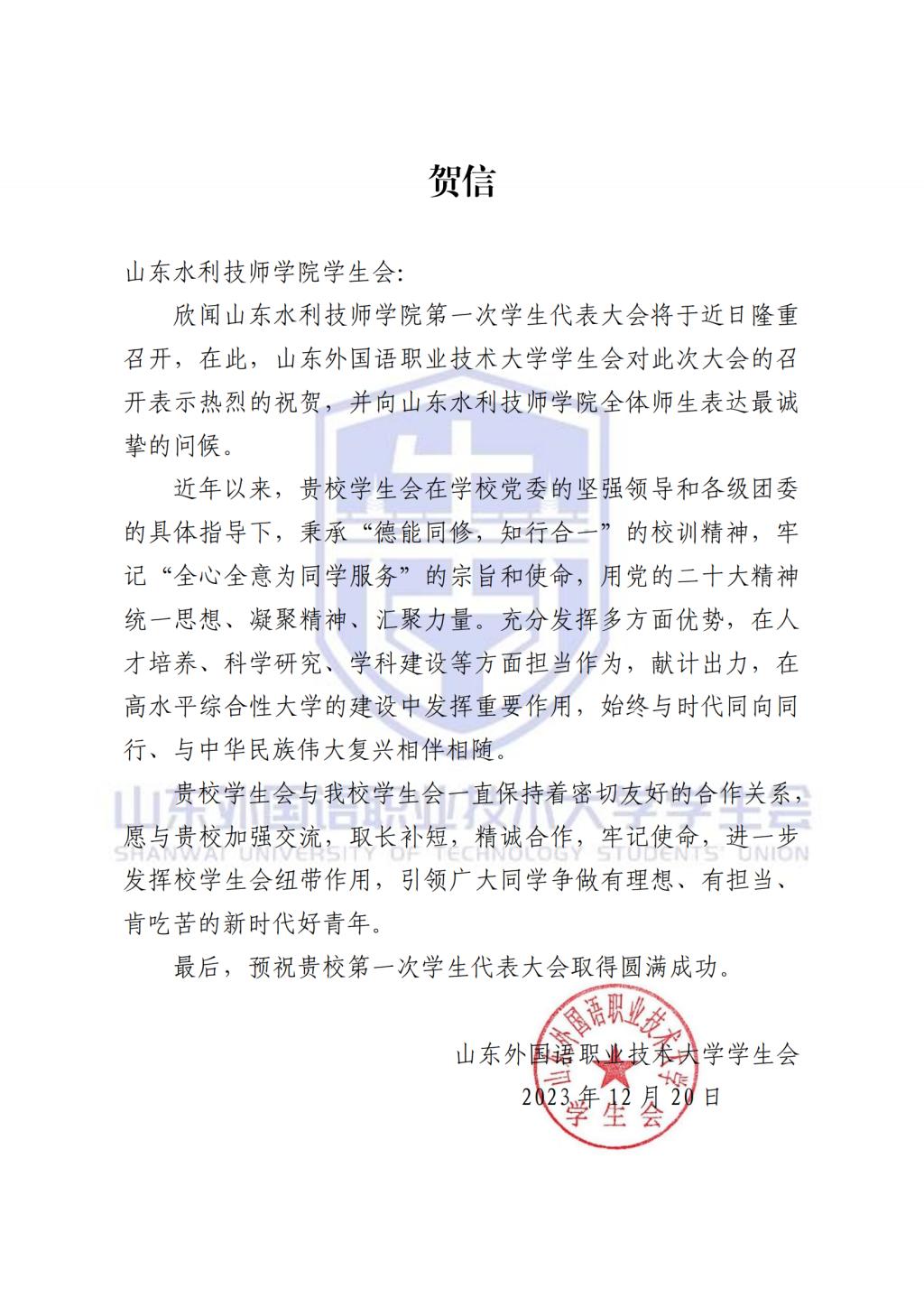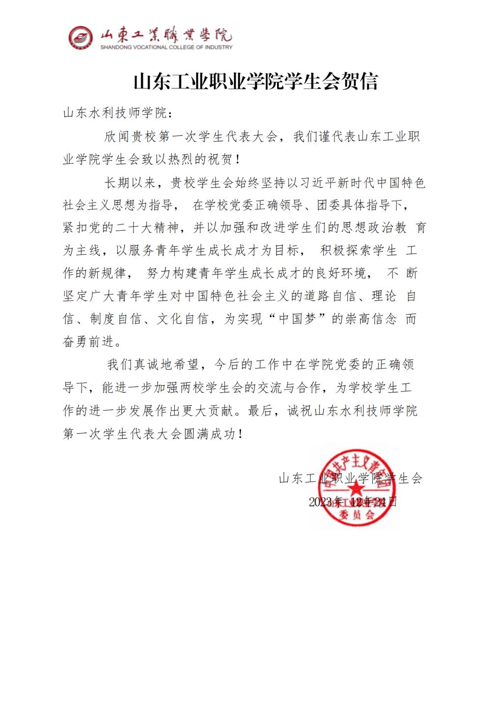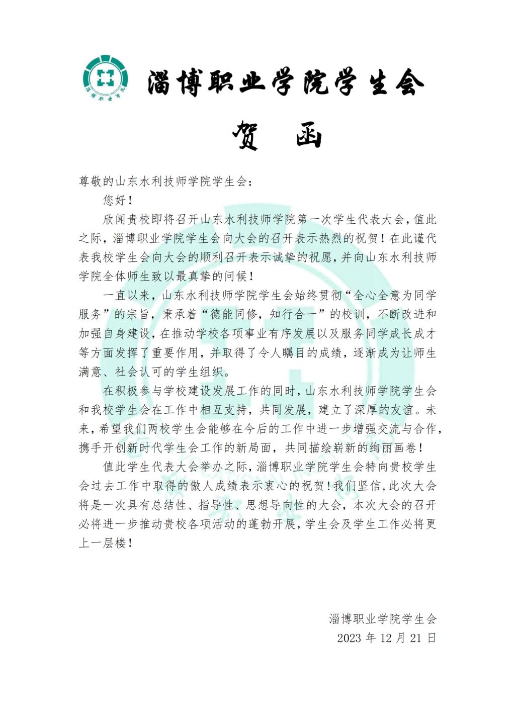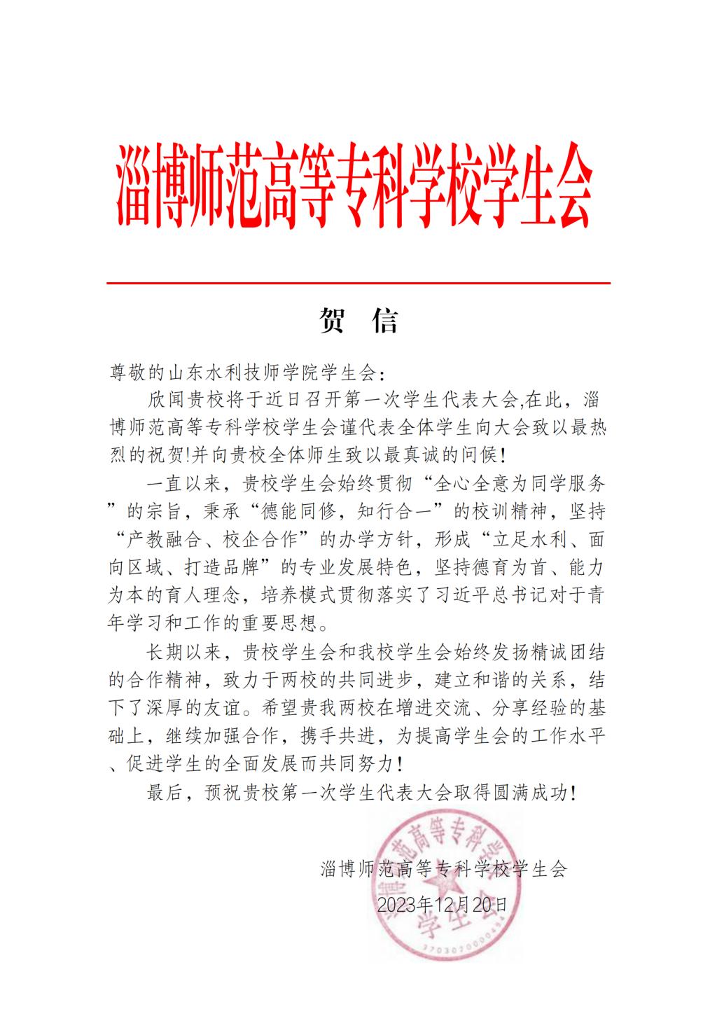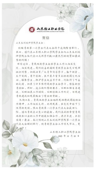 大会筹备期间,山东工业职业学院、山东轻工职业学院、山东外国语职业技术大学、淄博师范高等专科学校、淄博职业学院、淄博技师学院等兄弟院校学生会,纷纷发来贺信和祝福视频,传达了最美好的祝福和最真挚的问候。