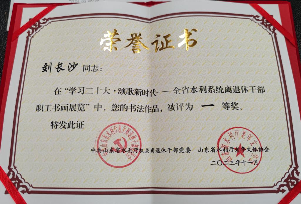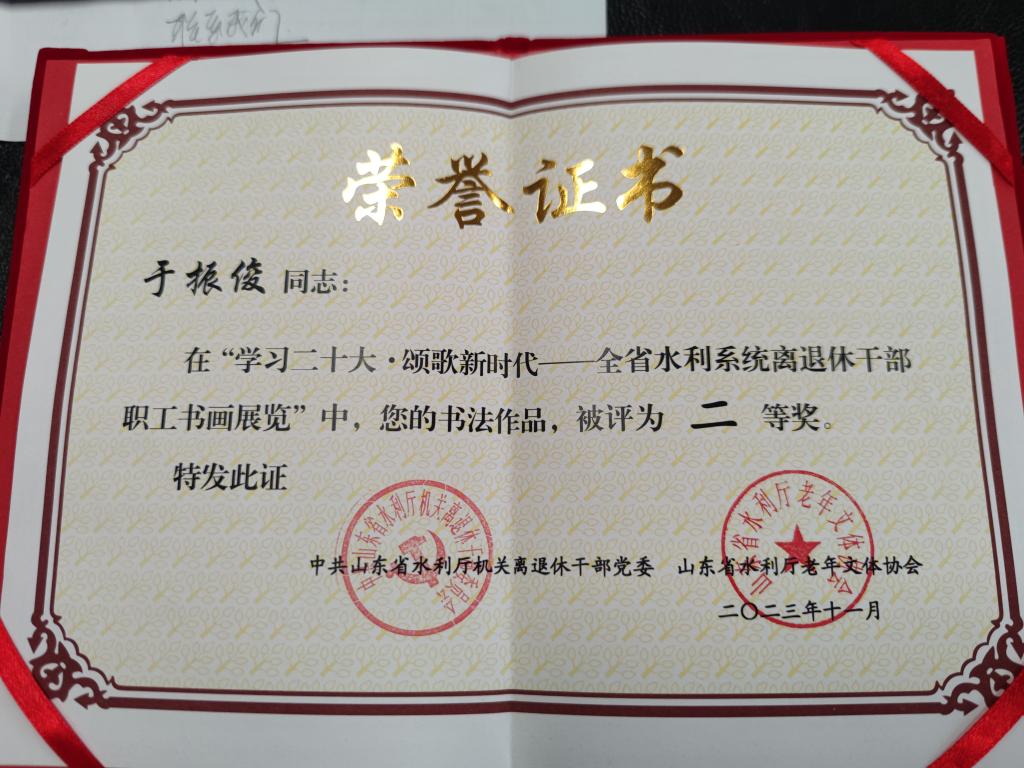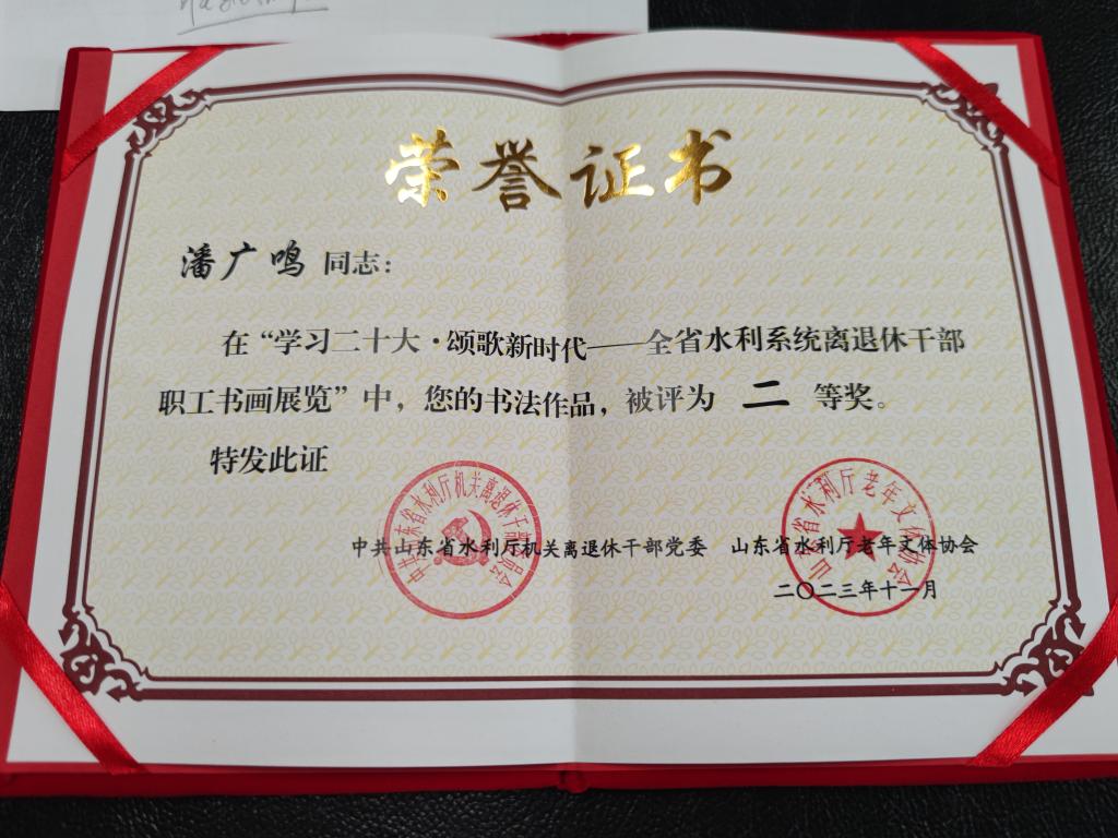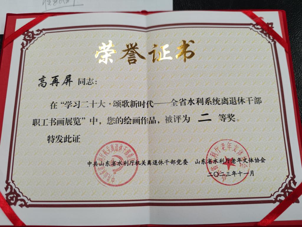 近日,山东水利技师学院退休干部多幅书画作品,在全省水利系统离退休干部“学习二十大·颂歌新时代”主题书画作品展中获奖。