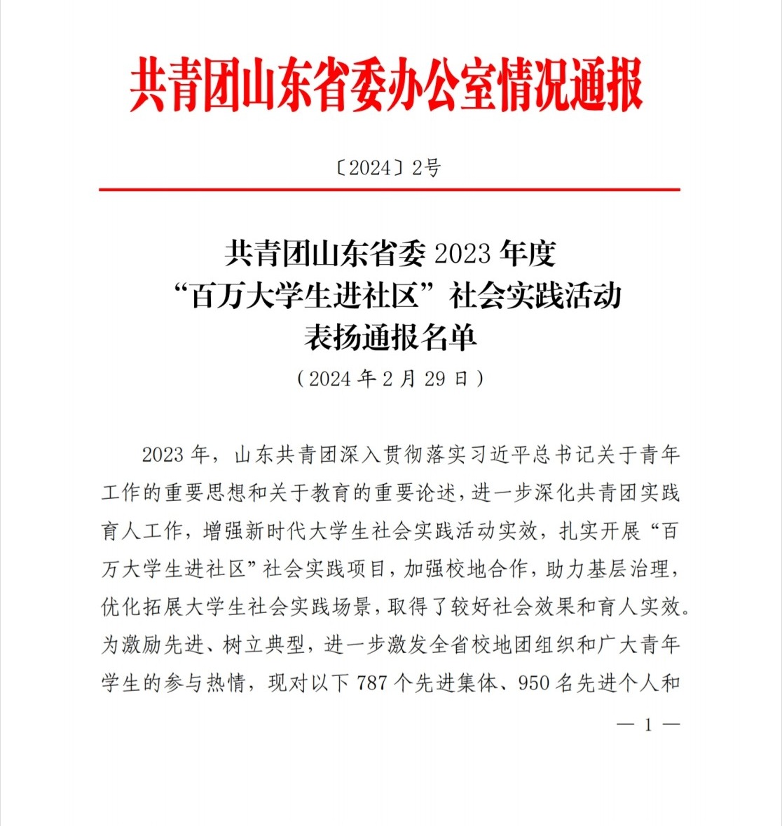 “百万大学生进社区”社会实践活动由共青团山东省委主办,旨在引导广大大学生深入社区、了解社区、服务社区,增强社会责任感,提升实践能力。学院积极响应号召,开展了环保宣传、理论宣讲、关爱老人儿童等形式多样的志愿服务活动,展现了青年担当,传播了正能量,为社区发展注入新活力,用实际行动践行了“奉献、友爱、互助、进步”的志愿服务精神,受到共青团山东省委的表扬通报。