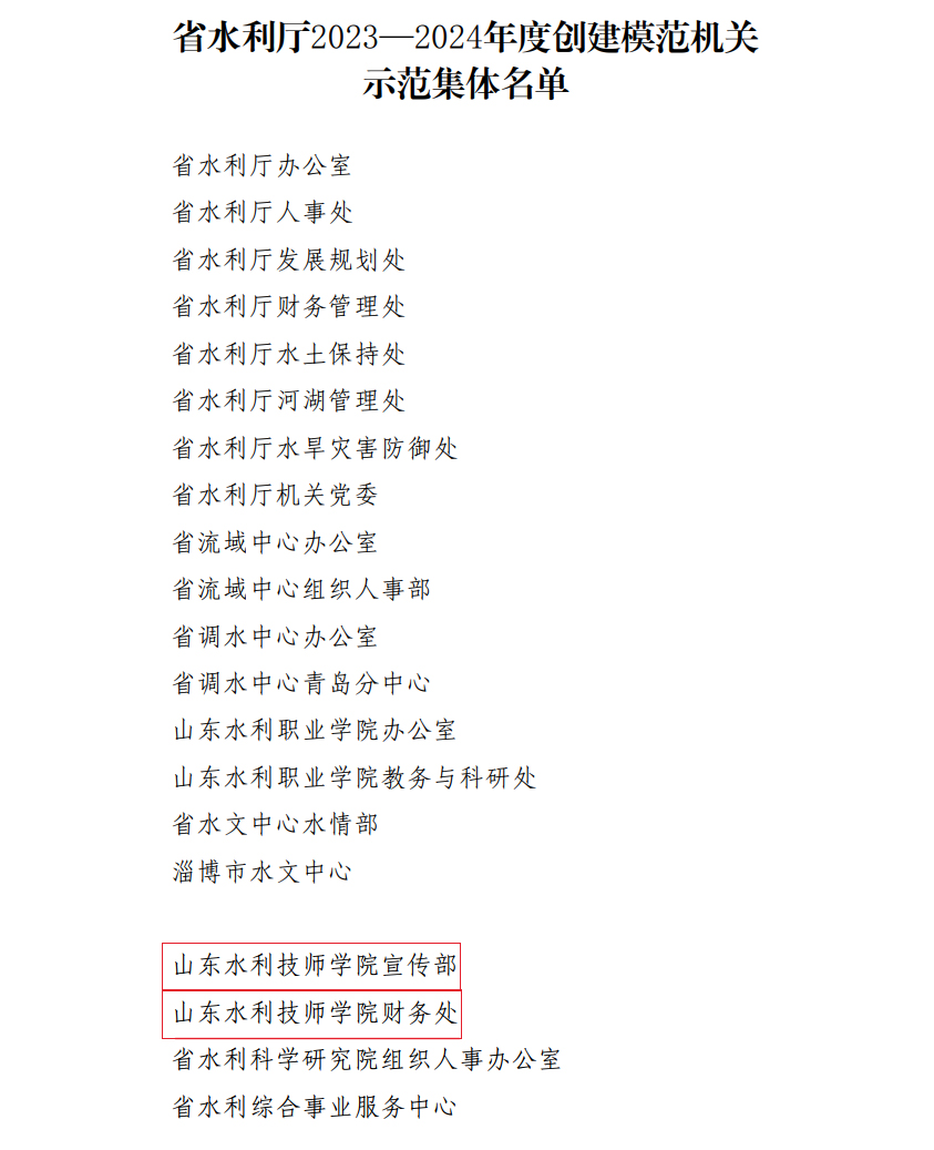 近日,中共山东省水利厅党组印发《关于表扬创建模范机关示范集体的通报》,对20个集体予以通报表扬,山东水利技师学院宣传部、财务处榜上有名。