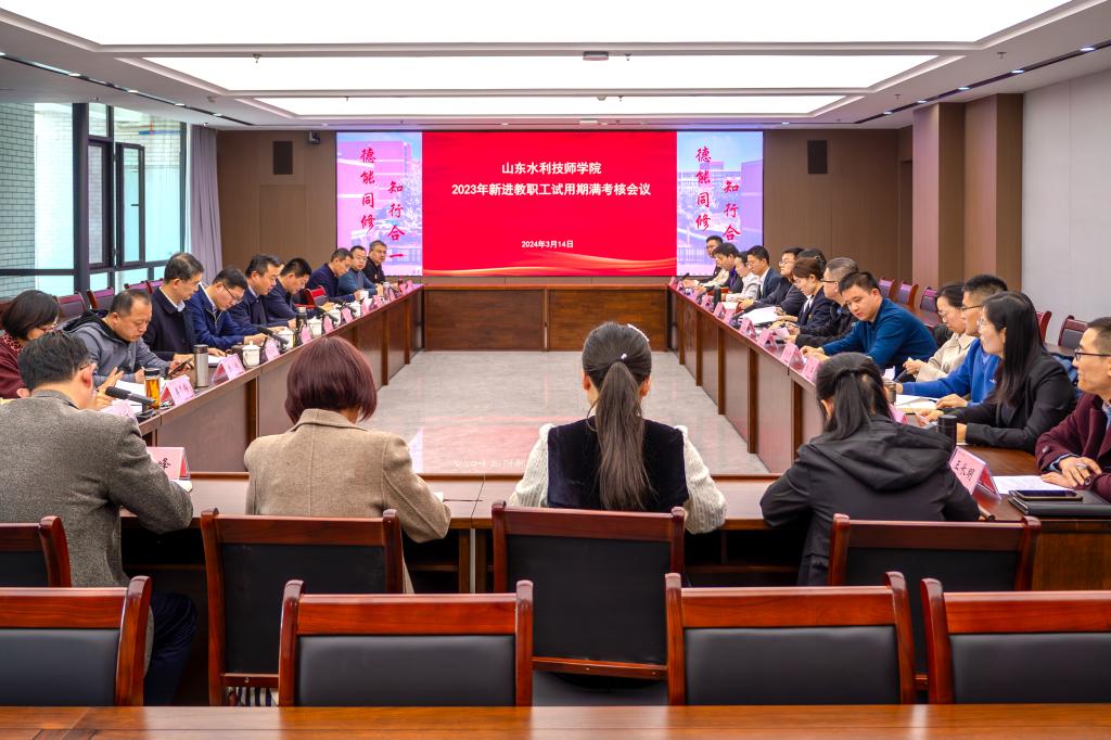 近日,山东水利技师学院召开2023年新进人员试用期满考核会议,从德、能、勤、绩、廉等方面,综合考察评价16名新进人员试用期间表现。学院领导边敦典、郑金刚、张文博、穆云丽、孙大广出席会议,并与新进人员亲切座谈。