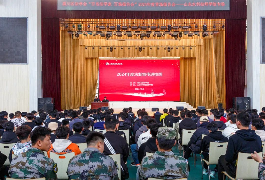 3月26日,山东水利技师学院举行2024年度法制宣传进校园活动第一期讲座。淄川区政法委书记杨强、区人民法院刑事审判庭庭长郑峰出席活动,学院1200余名学生聆听讲座。