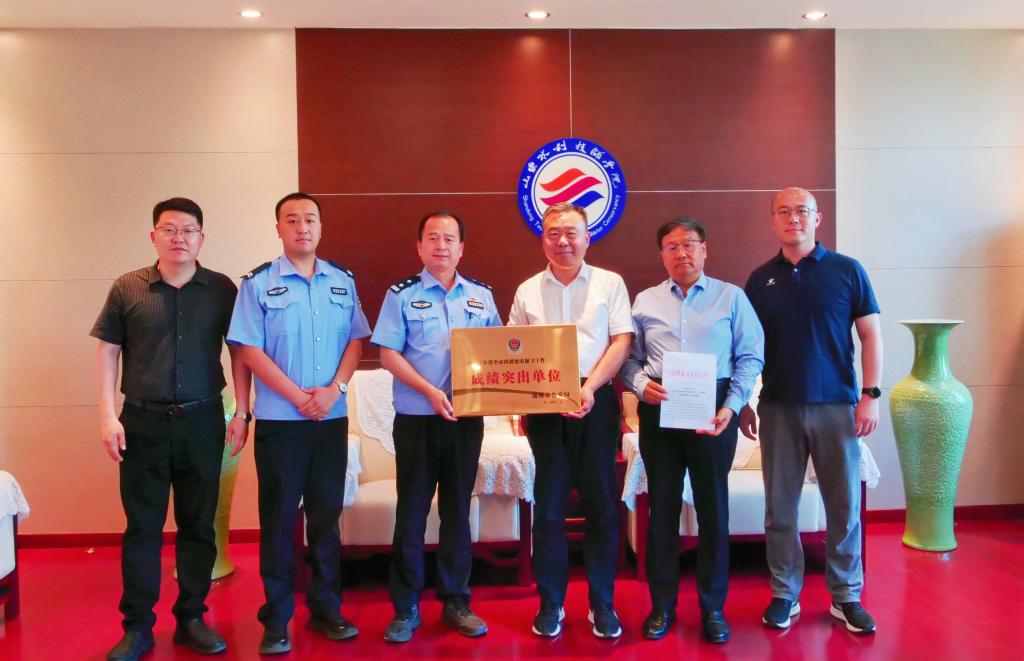 近日,淄博市公安局发布《关于全市单位内部治安保卫工作成绩突出集体和个人的通报》,山东水利技师学院安全管理处荣获“二〇二三年度全市内部治安保卫工作成绩突出单位”荣誉称号。市公安局民警徐春蕾同志代表市公安局到校宣布表彰决定。院长边敦典与办公室、安全管理处负责同志接受荣誉牌,并座谈交流。