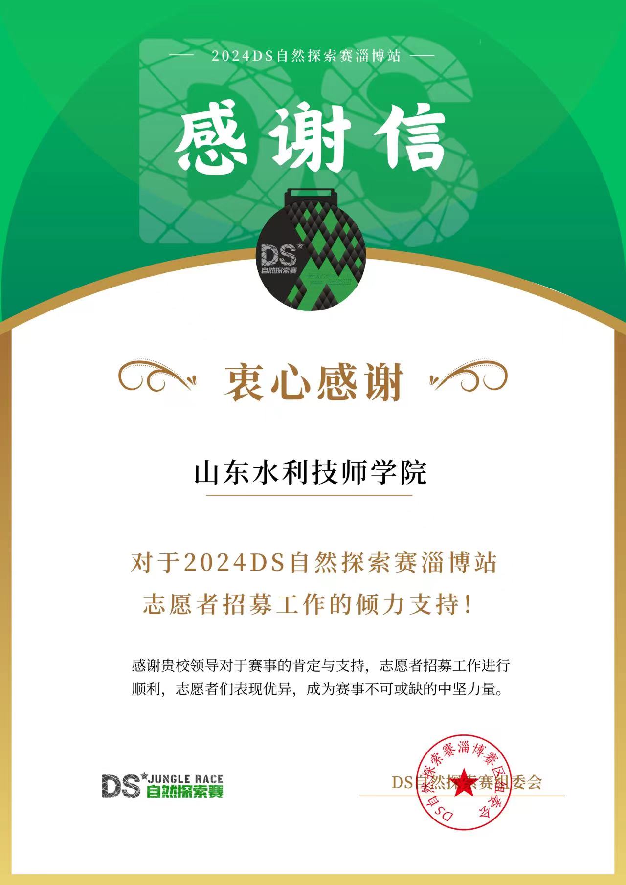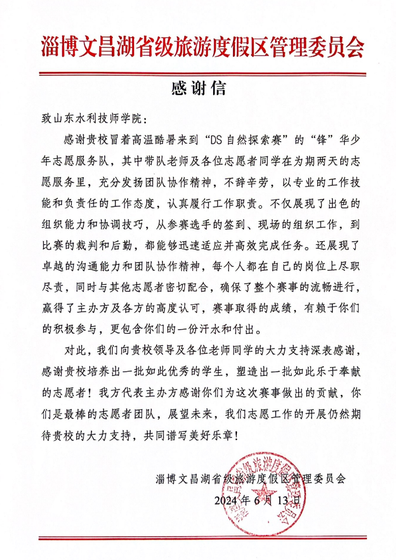 “感谢贵校领导对于赛事的肯定与支持,志愿者们表现优异,成为赛事不可或缺的中坚力量。”6月13日,两封分别来自“DS自然探索赛”淄博赛区组委会和主办方淄博文昌湖省级旅游度假区管理委员会的感谢信,送至山东水利技师学院,表达了对学院支持该赛事志愿者招募工作的赞赏。