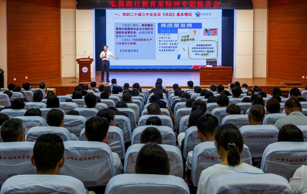 边敦典阐述了《中共中央关于进一步全面深化改革推进中国式现代化的决定》(以下简称《决定》)的重大意义,结合山东水利改革发展和学院教育改革实践,解读了《决定》的重大改革措施,要求全院教职工要深入学习宣传贯彻党的二十届三中全会精神,全面准确把握职业教育的特点和发展趋势,深刻弘扬践行教育家精神,以更加饱满的热情和更加务实的态度,投入到学院高质量发展中去,为培养更多高素质技能型人才贡献水院力量。