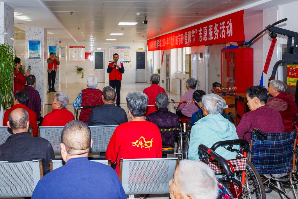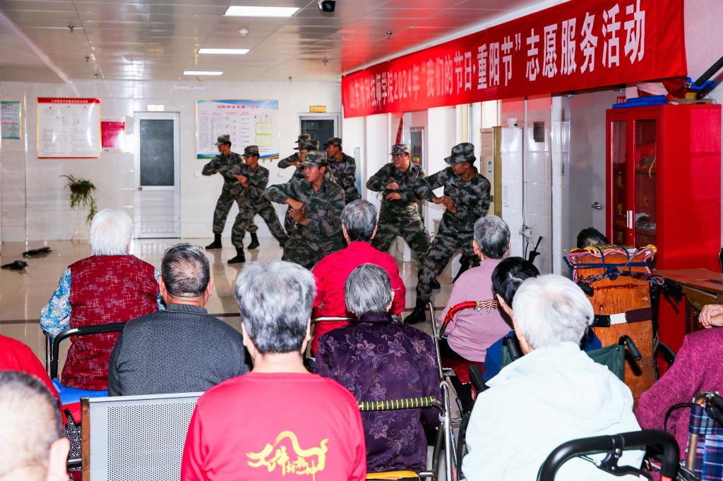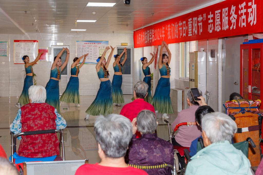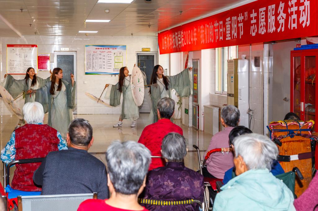 在淄川区公孙养老中心,师生志愿者首先为老人们奉献了一台精彩的文艺演出,从团体节目到诗词朗诵,再到舞蹈表演,均赢得了老人们的热烈掌声。随后,教师志愿者化身爱心理发师,为有需要的老人们理发,以实际行动传递“用青春搀扶银发,用朝阳拥抱夕阳”的温暖正能量。