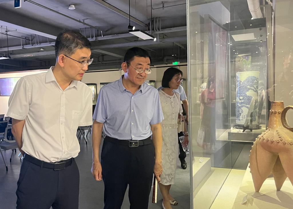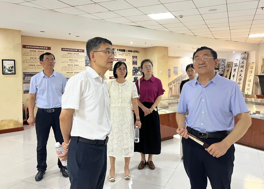 在山东理工大学马克思主义学院党委书记郭万保的陪同下,孙大广一行先后参观了校园文化建设展区、尹干艺术博物馆、思政实践基地及校史馆。通过图文展板、互动体验区等载体,深入了解山东理工大学“厚德、博学、笃行、至善”的校训精神与特色育人模式。