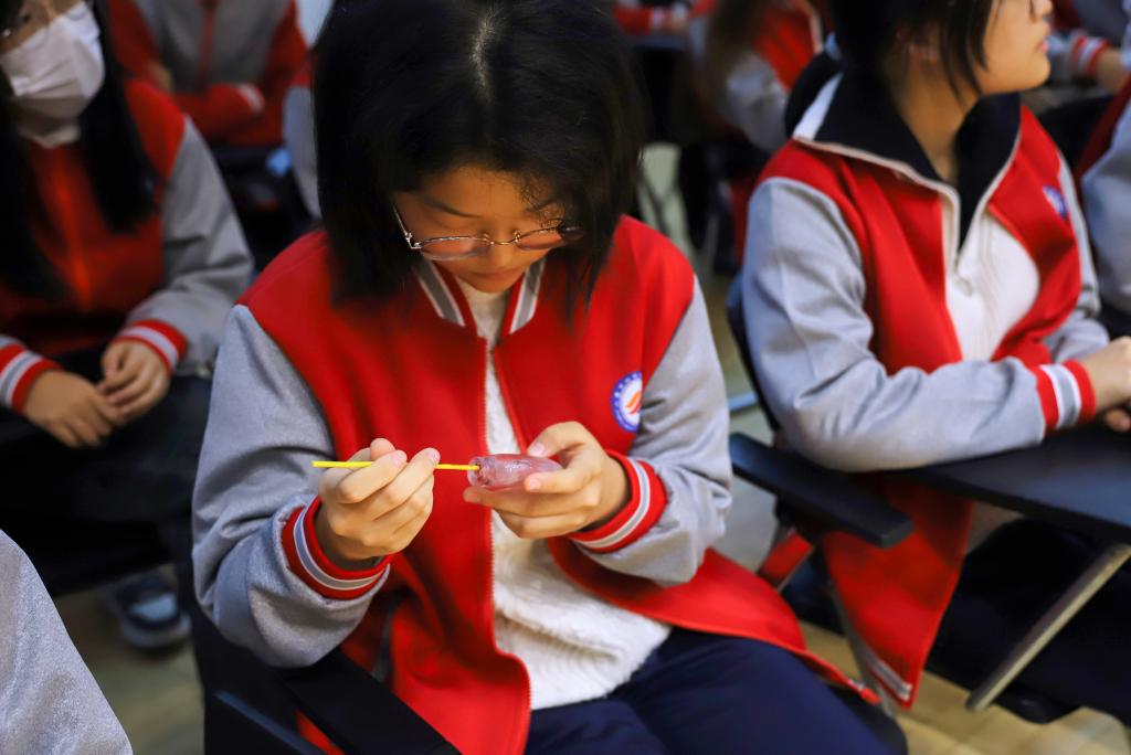 在工艺展示环节,郑玉慧拿出内画壶、画笔等工具,手把手演示内画创作的关键步骤——从壶坯处理、构图设计,到笔尖蘸墨、精细勾勒,每一个动作都尽显匠心;互动环节中,师生们积极参与,踊跃提问。“内画创作最难的部分是什么?”“如何在传承中实现创新,让年轻人更喜欢内画艺术?”面对师生们的提问,郑玉慧耐心解答,让大家直观感受到了非遗技艺的独特魅力和传承的不易。